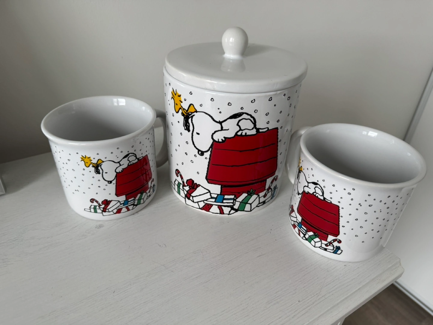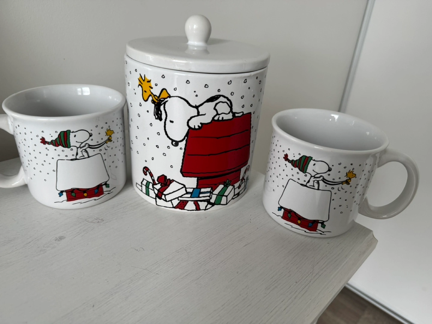 Set of two mugs and a cookie jar. Featuring a Christmas scene with Snoopy and Woodstock.