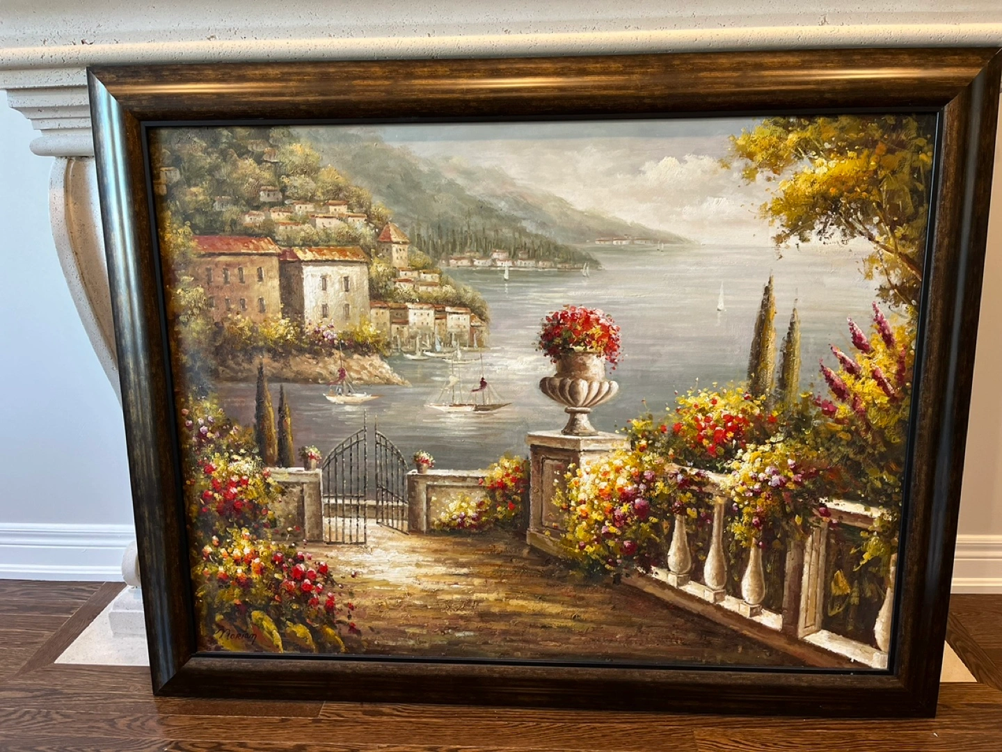 33Large oil on canvas painting depicting a beautiful Lake Como village scene. Signed by the artist. Will brighten and complete any room. In great condition. Framed in wood frame measuring approx. 54.5"H x 42.5"Wf