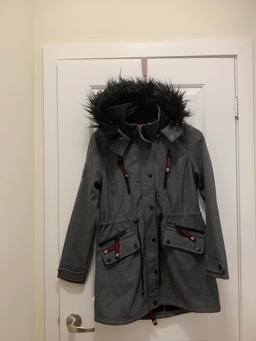Grey winter jacket with a faux fur hood. Zipper and button closure. Multiple pockets with zipper closures.
