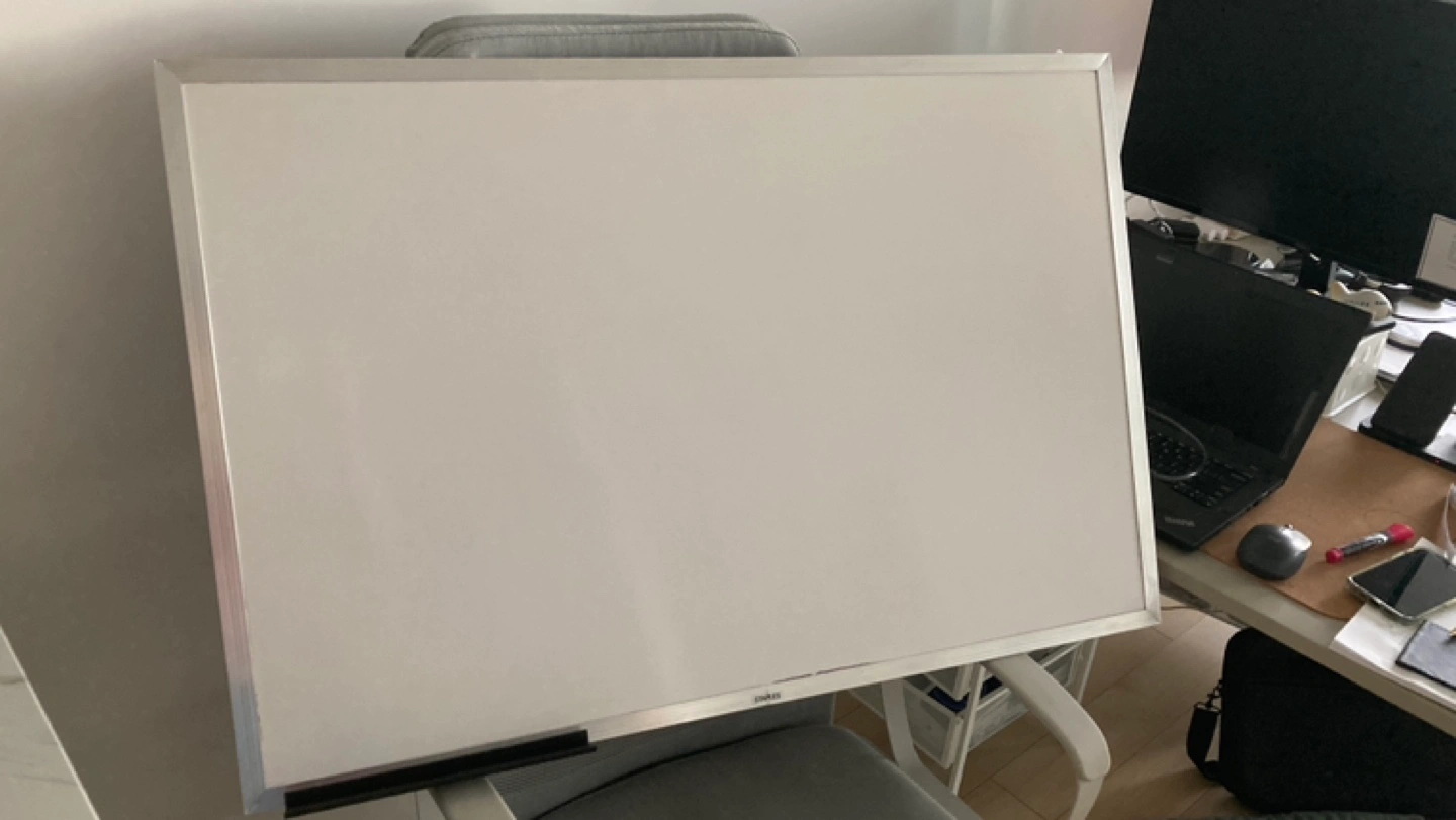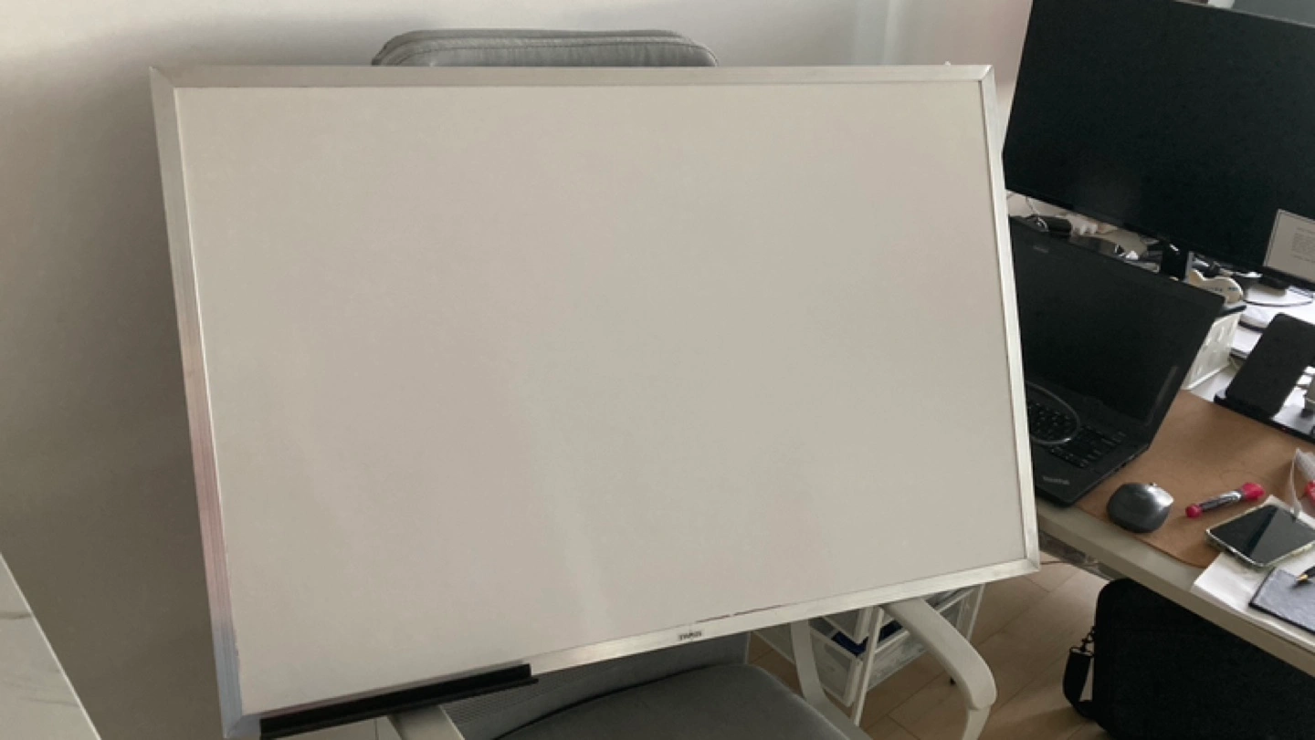 118Large whiteboard with a silver frame. Includes a marker tray. Staples melamine marker board bought for 60cad