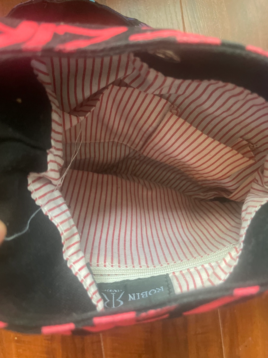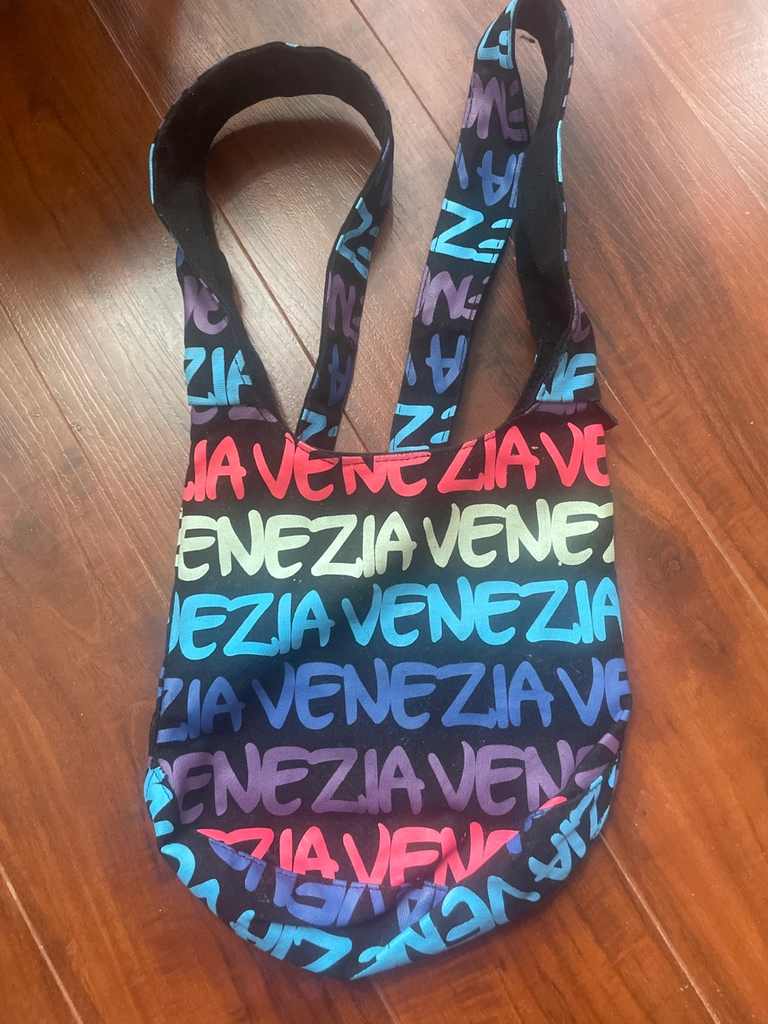530Small, black canvas bag with Venezia print. Features a zip closure and red striped lining.