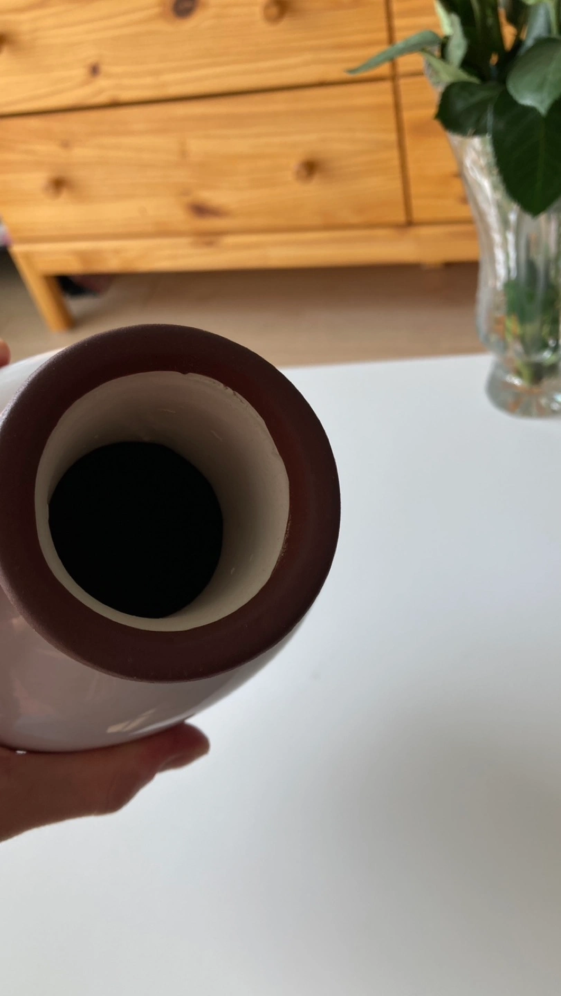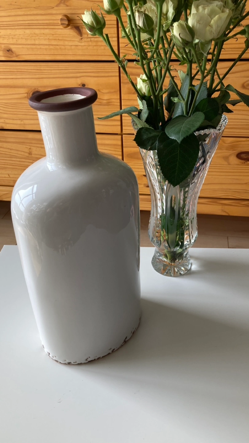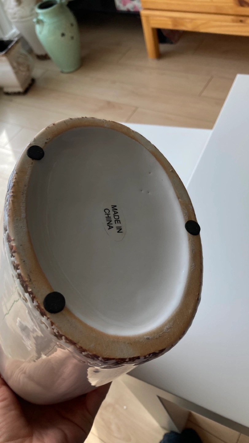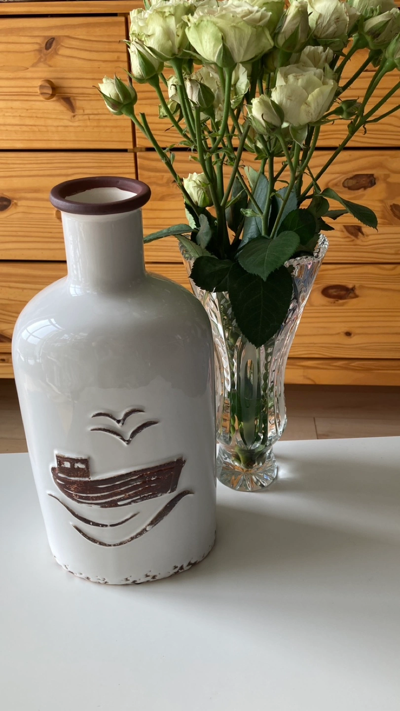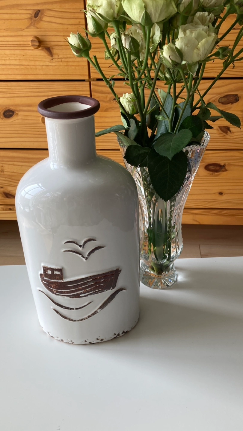 118Tall white ceramic vase with brown boat design, brown rim, and a distressed look. New.