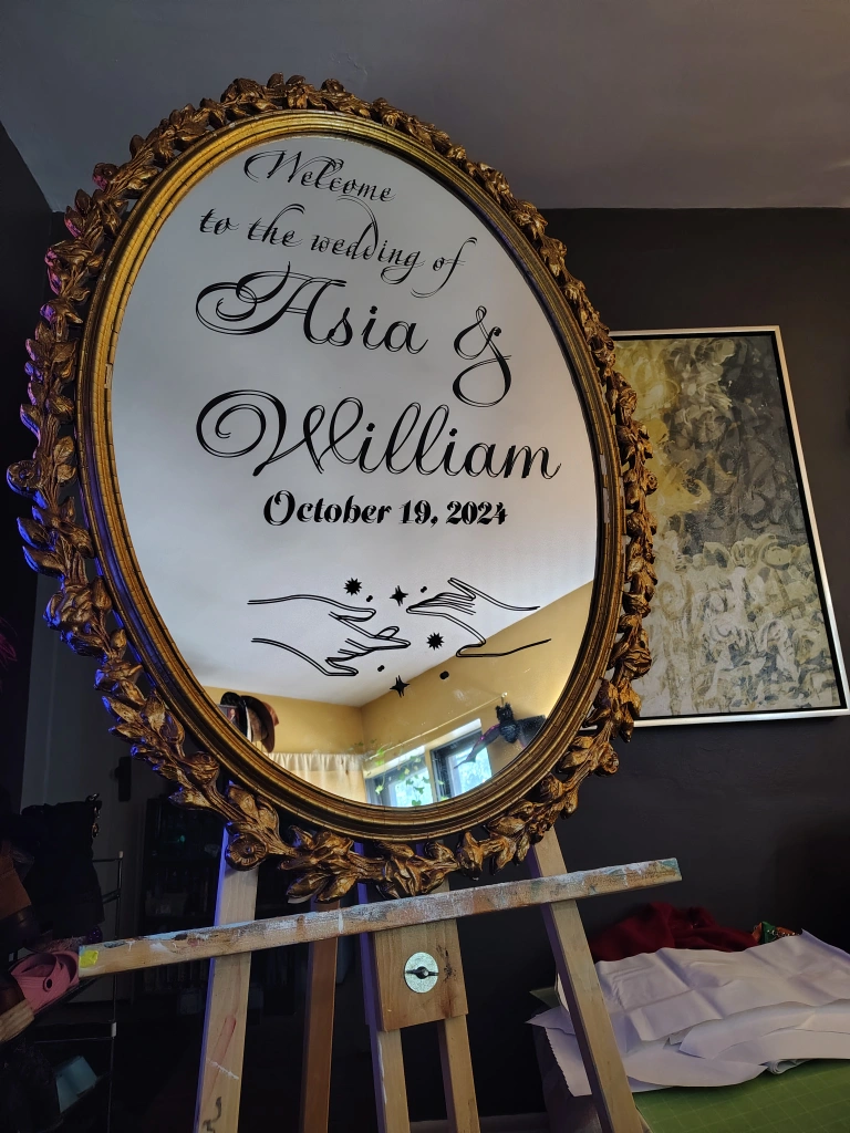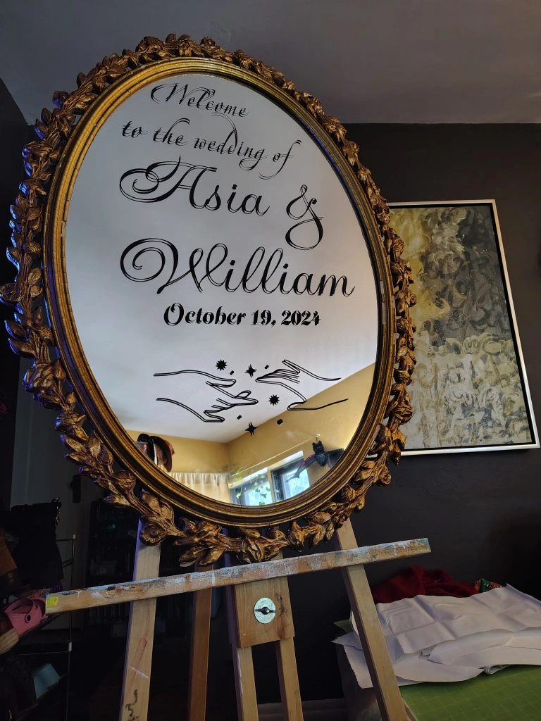 Antique mirror, some small chips on the edge, used once as a welcome sign for my wedding. I will remove the vinyl words.
