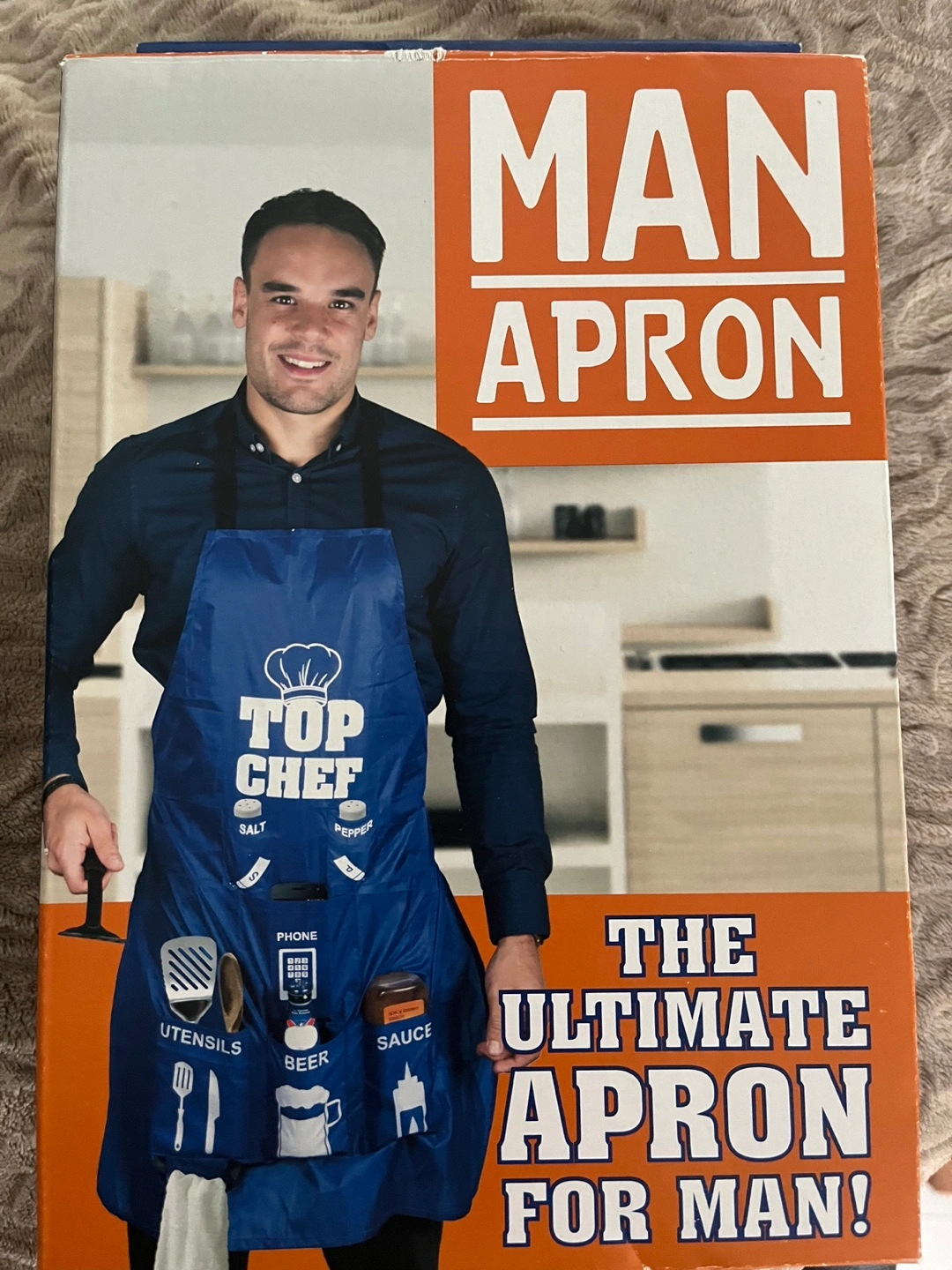 Blue apron with multiple pockets, a 'Top Chef' logo and pockets labelled for phone, beer, utensils, salt, pepper and sauce.