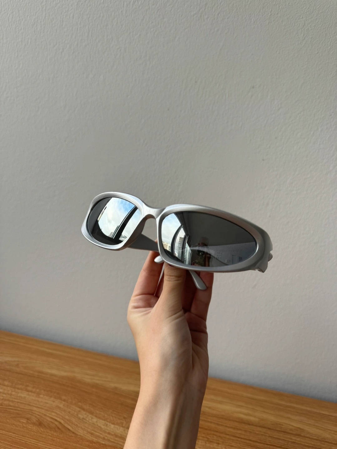 Silver sunglasses with reflective lenses.