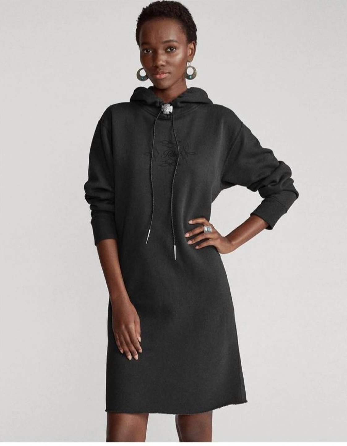 29Black hoodie dress with long sleeves and a drawstring hood. Features embroidered logo on the front. Size M. Fleece inside