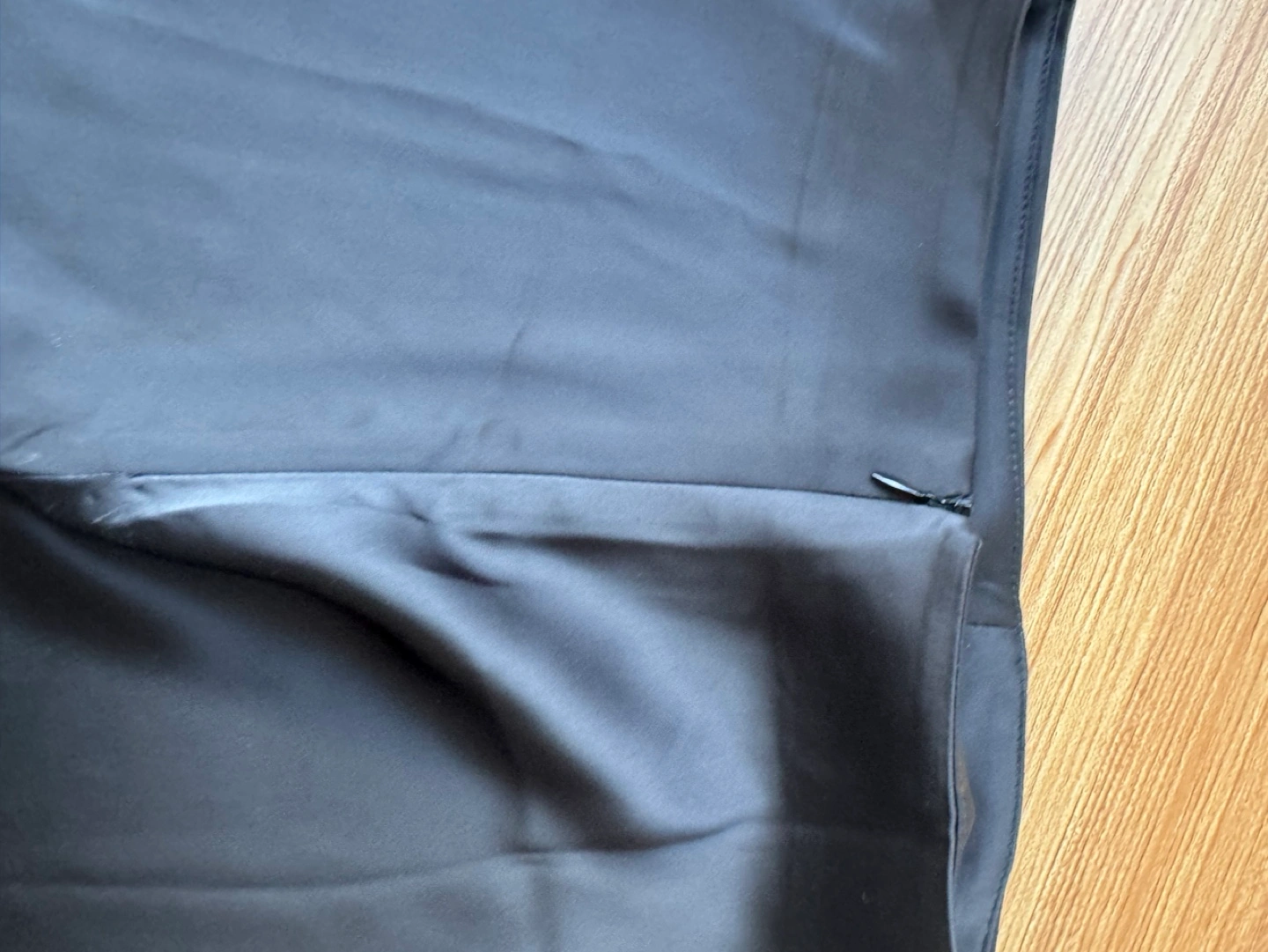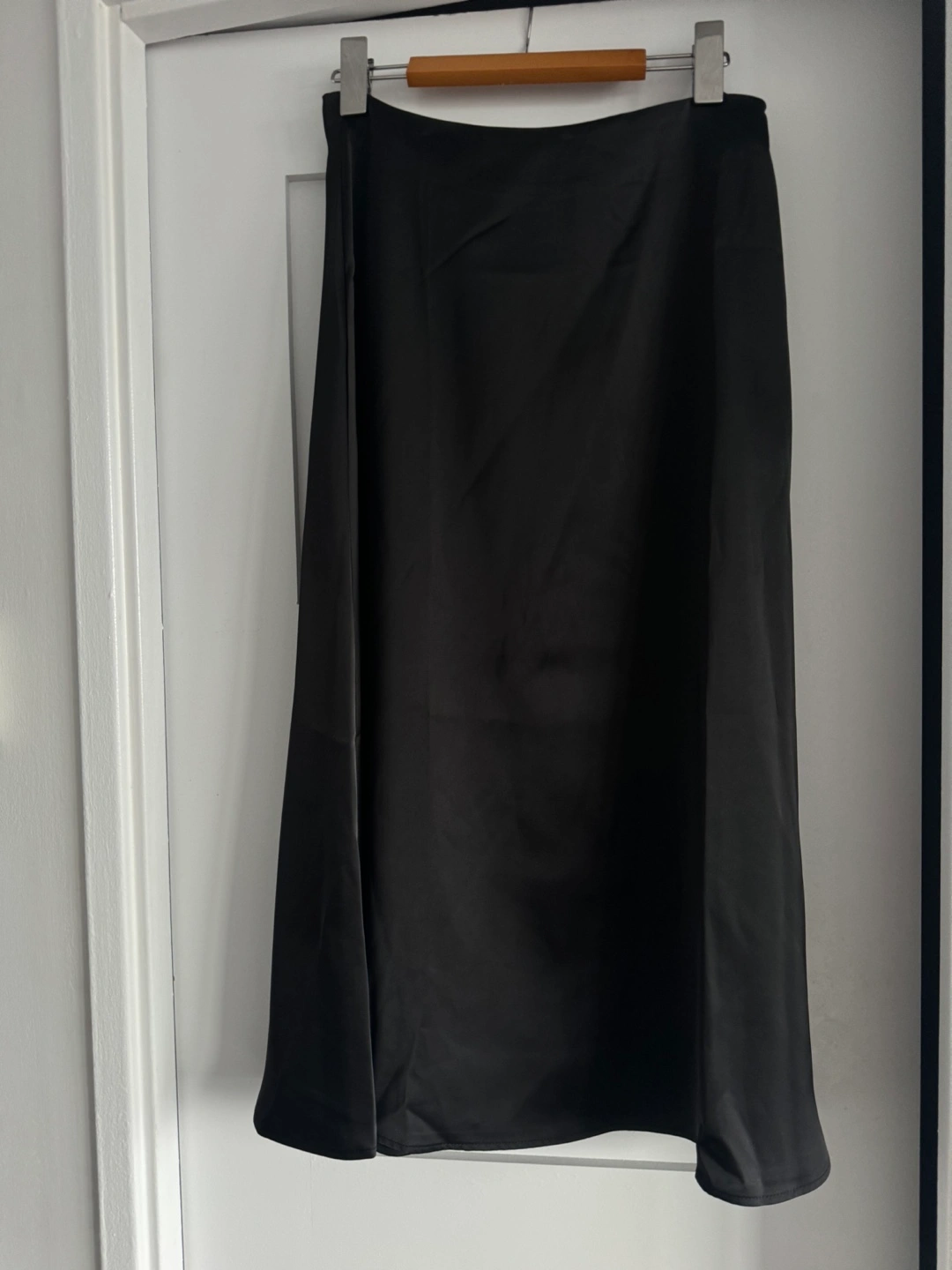 29Black satin midi skirt, high waisted, with a zipper closure in the back. Flowy and comfortable. Never worn