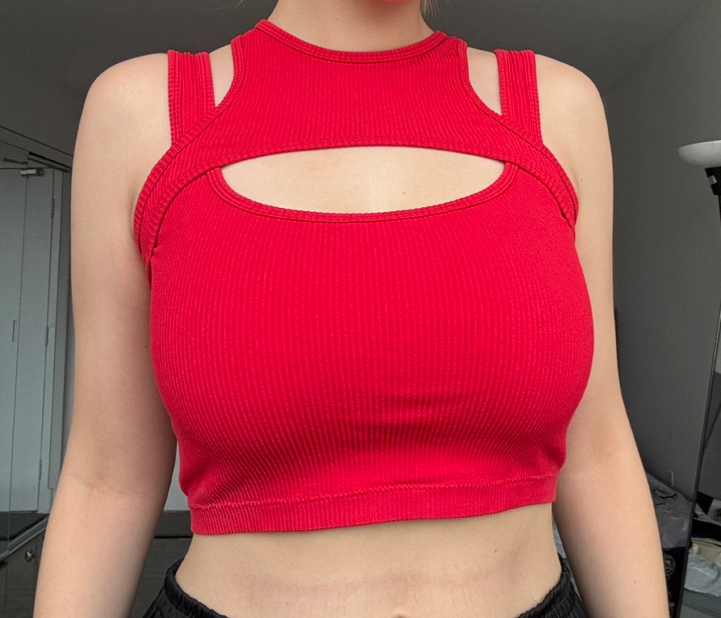 Red ribbed crop top with cut outs at the shoulders and a keyhole opening at the front.