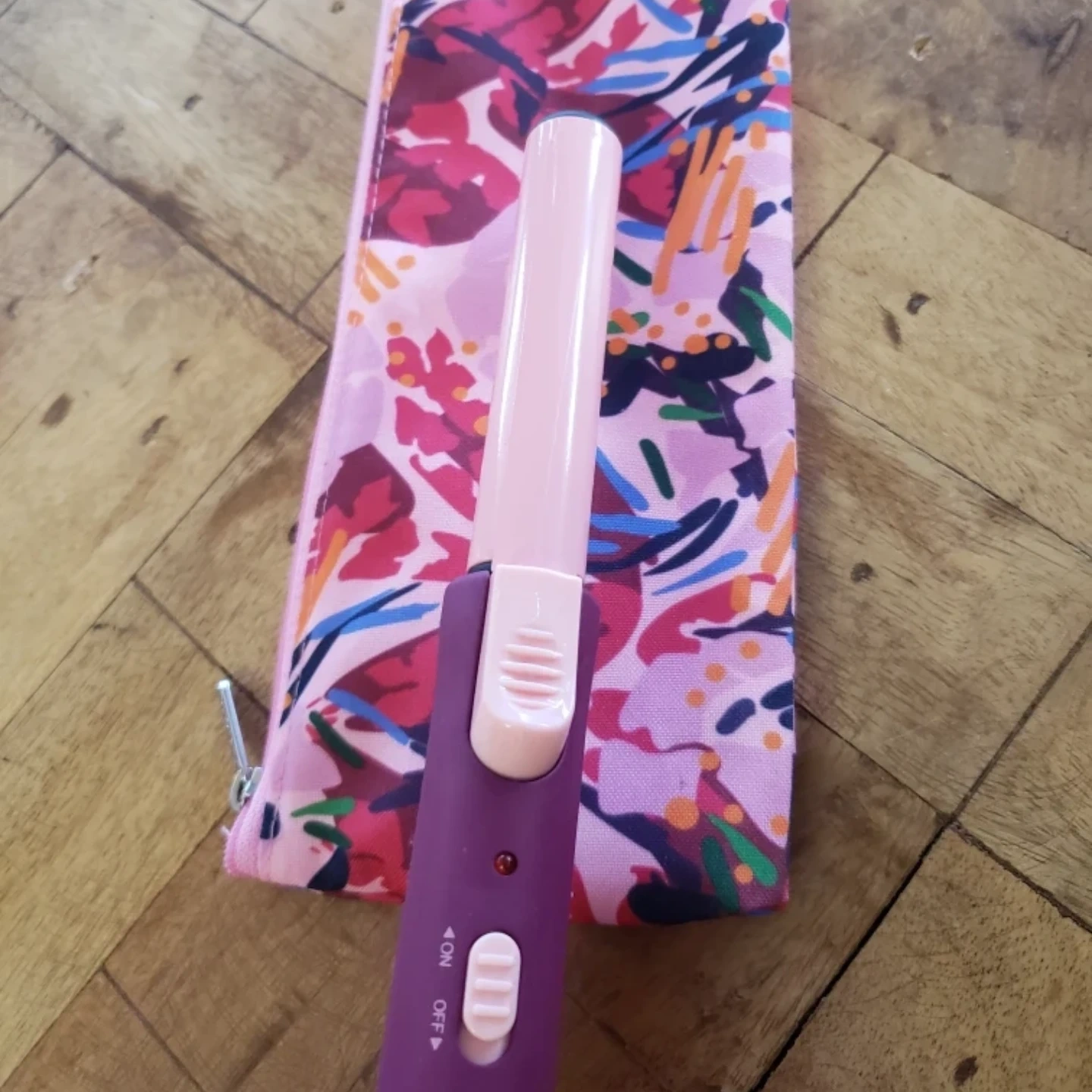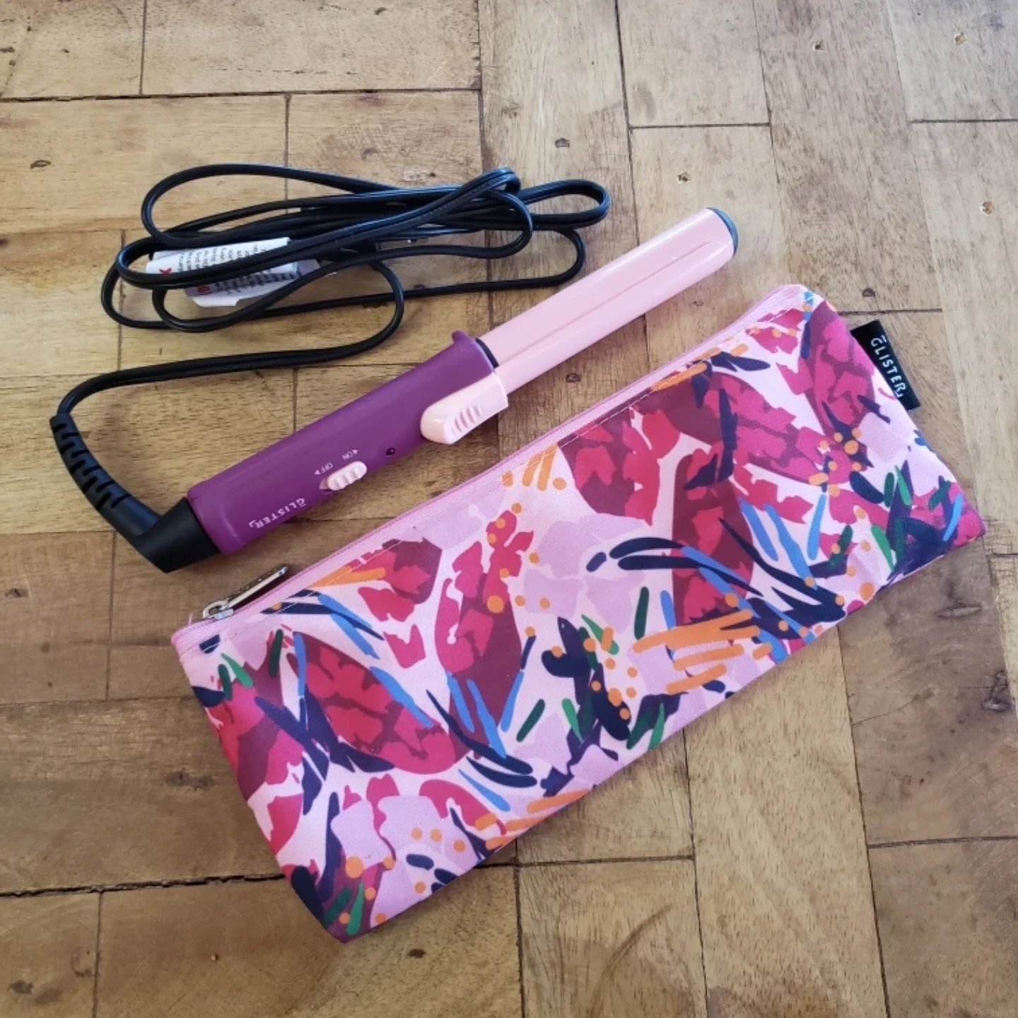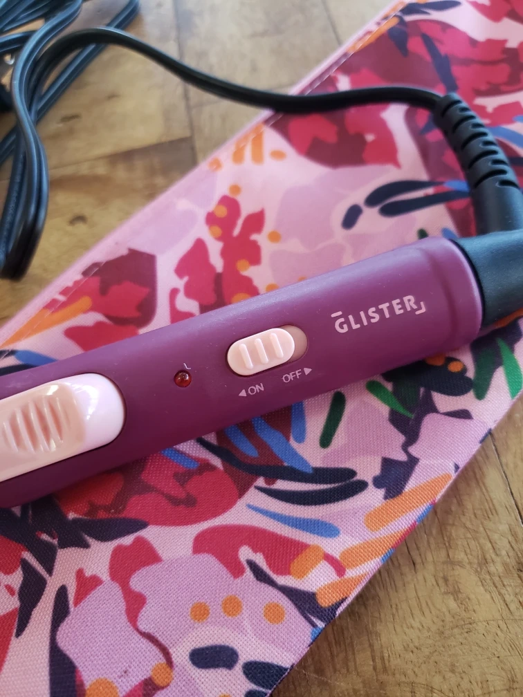 Glister pink and purple curling iron, with travel carrying case. New, never used.