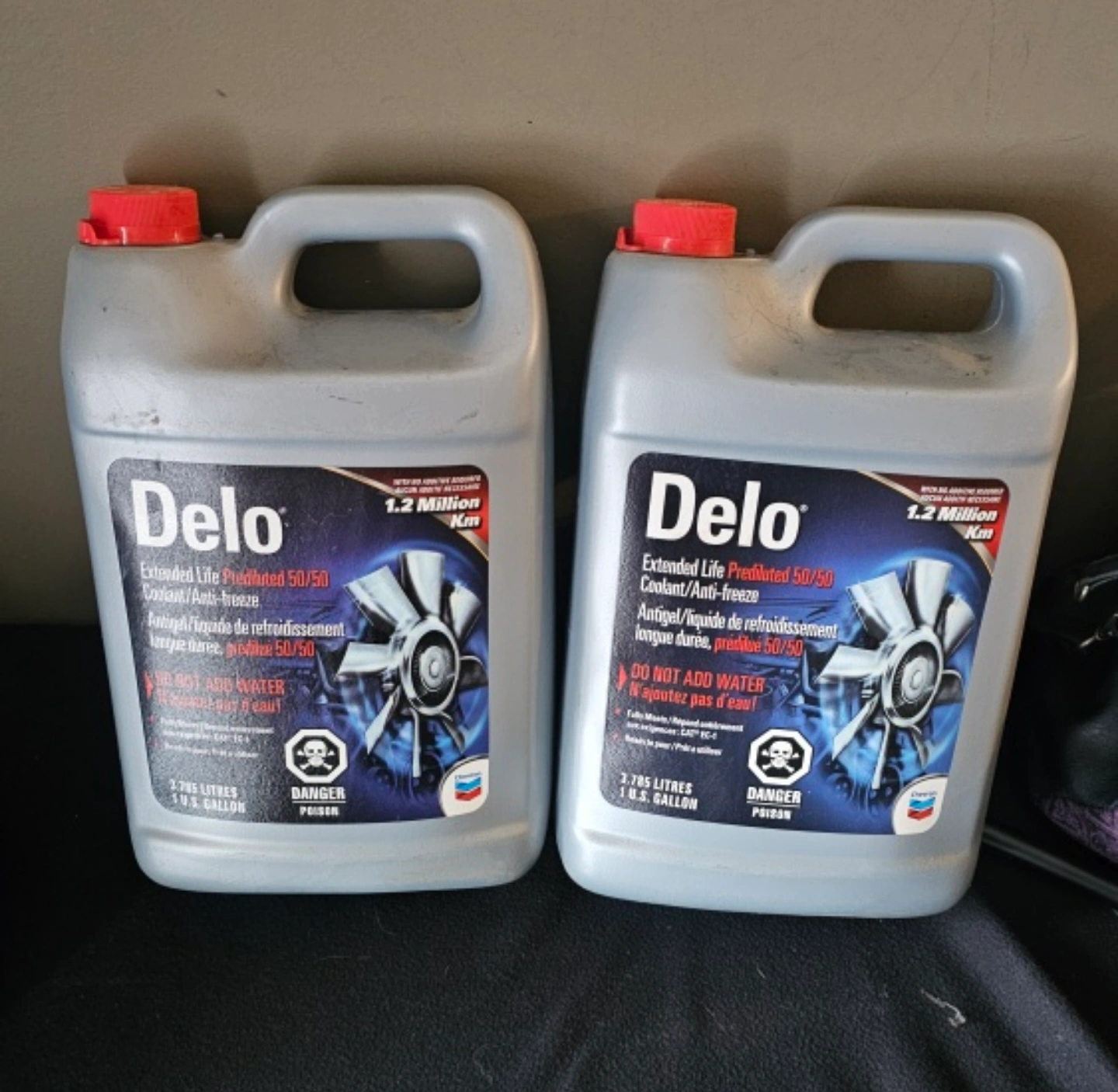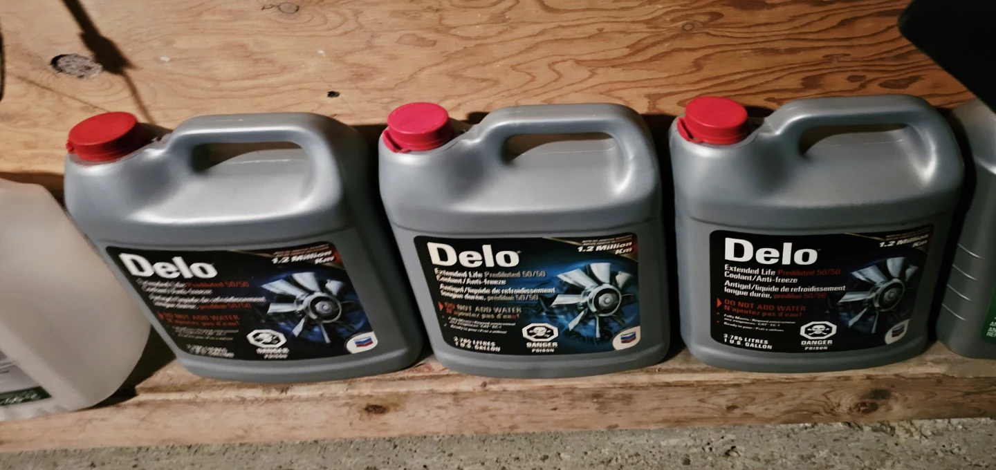 2 Full Jugs & 1 - 1/4 Jug of Delo Extended Life Prediluted 50/50 Coolant/Anti-freeze. 3.785 litres/1 U.S. Gallon each.