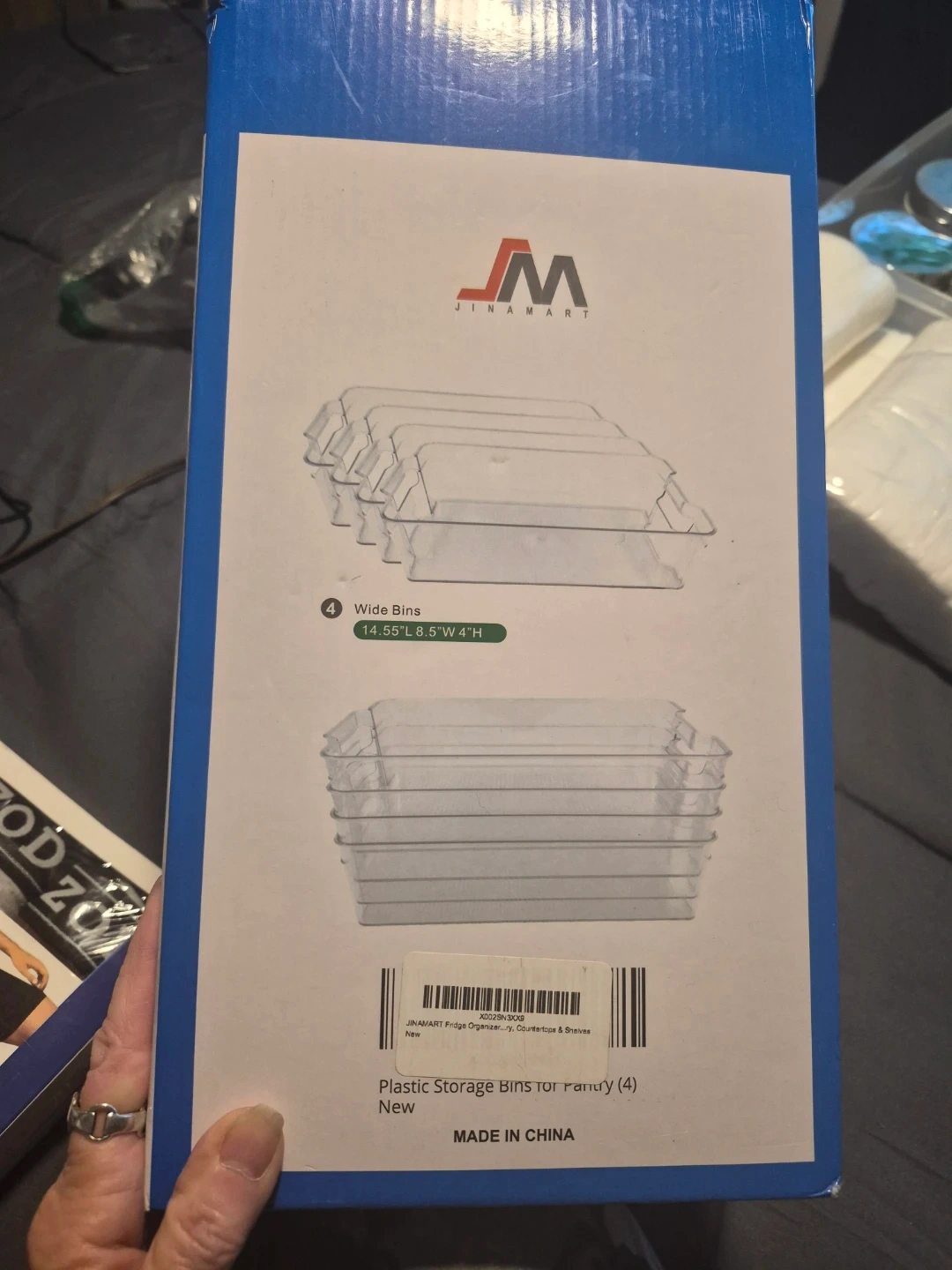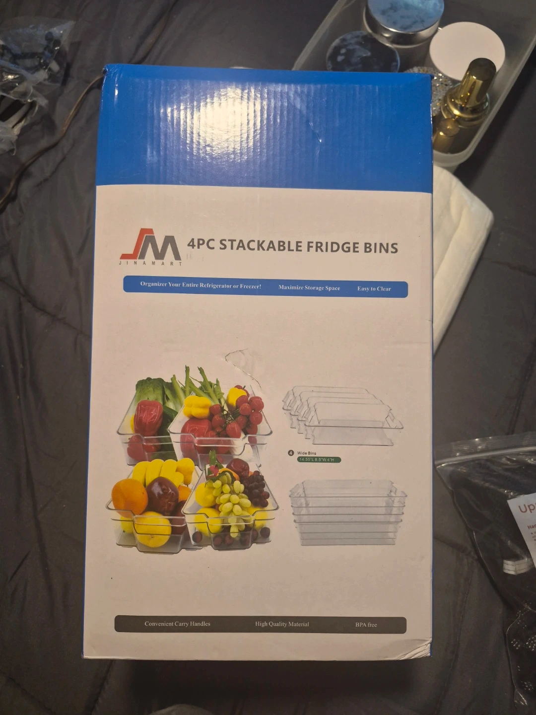 Selling a brand new set of Jinamart 4PC Stackable Fridge Bins! These clear plastic storage bins are perfect for organizing your refrigerator or freezer. They are BPA free and easy to clean. The dimensions are 14.55" L x 8.5" W x 4" H