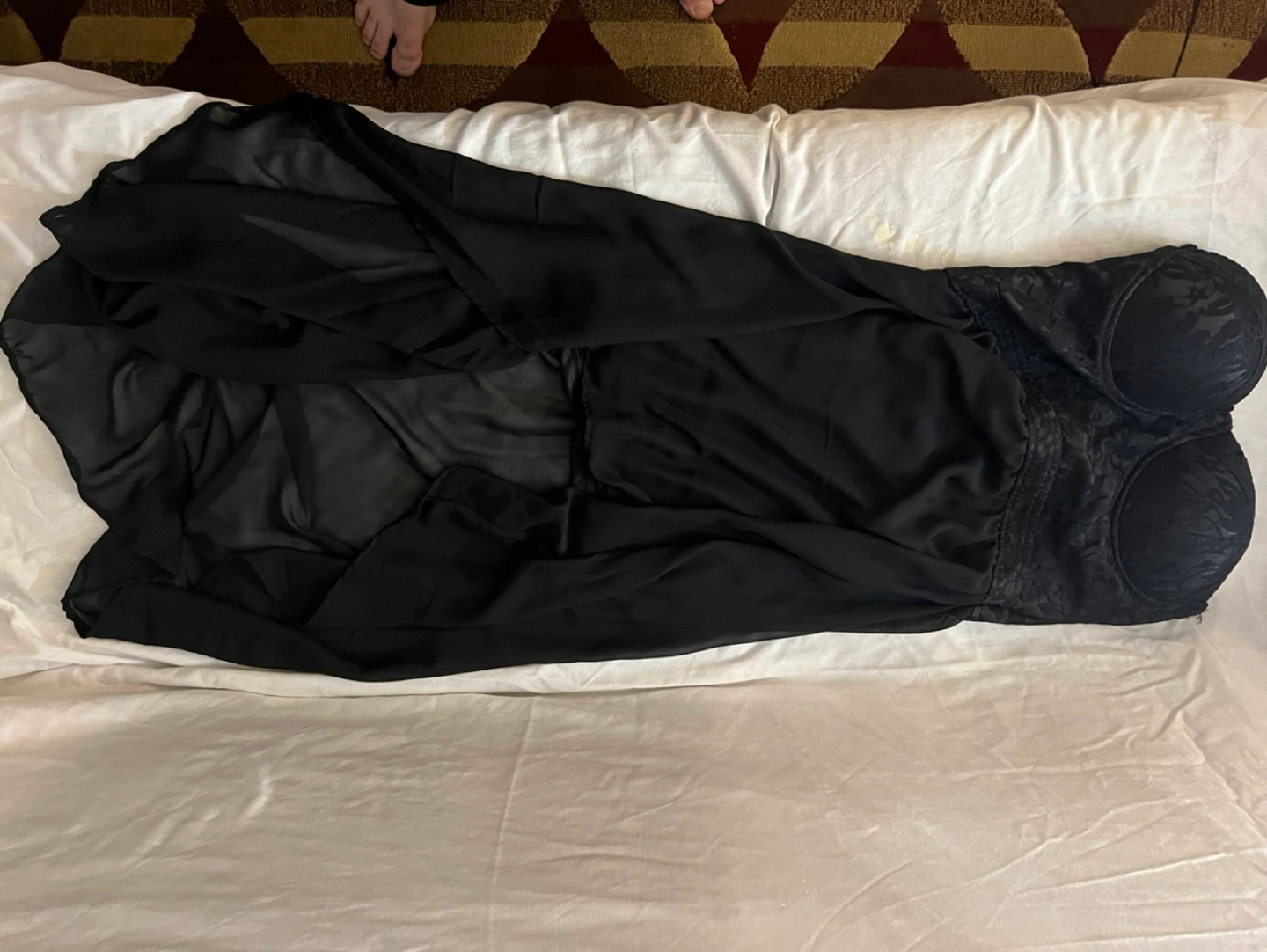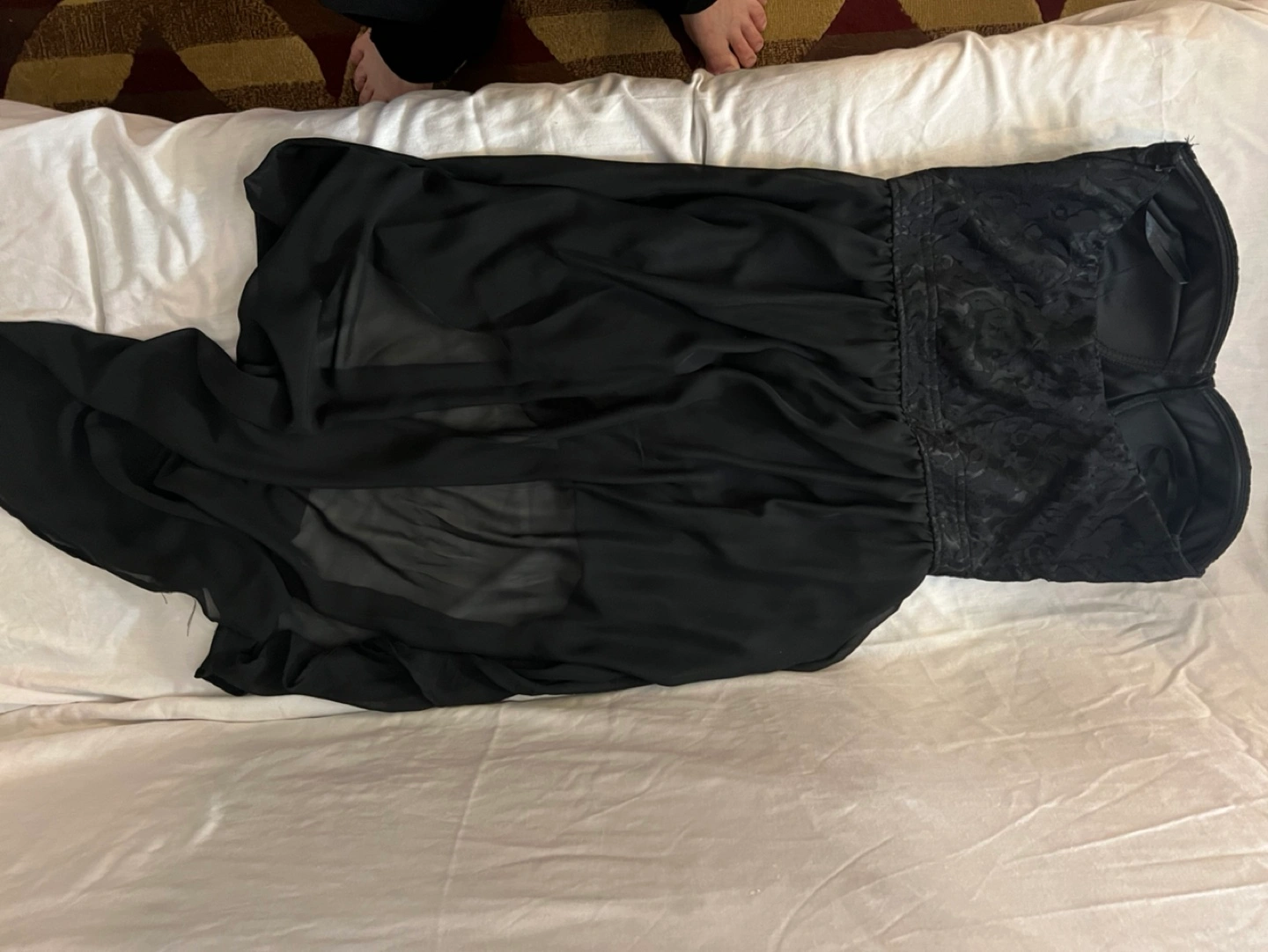 21Strapless dress with lace bodice and chiffon skirt. High-low style, with the back being longer than the front.