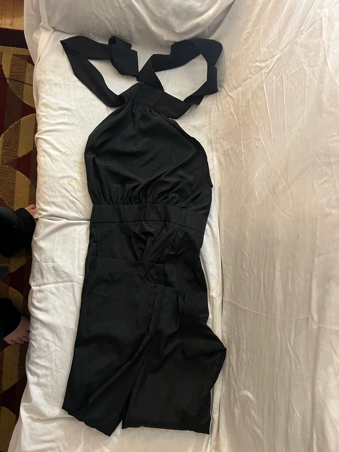 21Black halter jumpsuit with a wide leg and a tie at the neck.