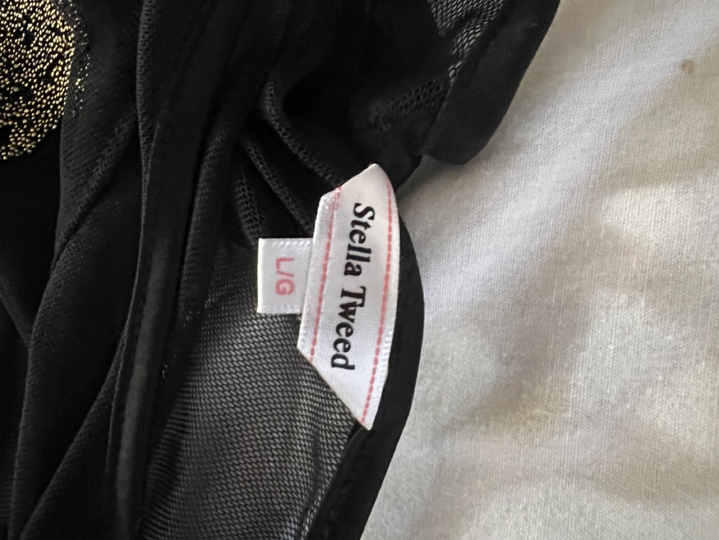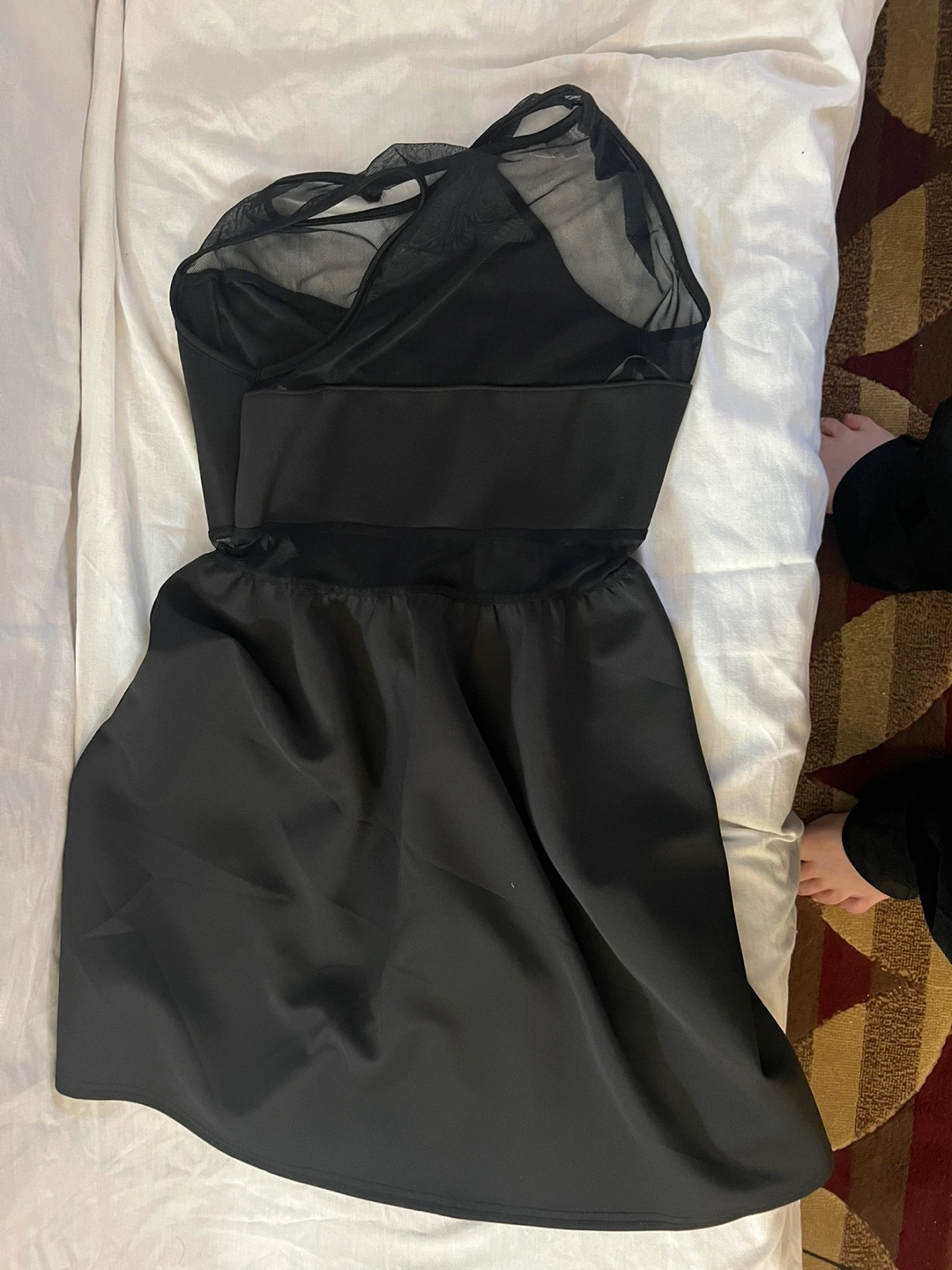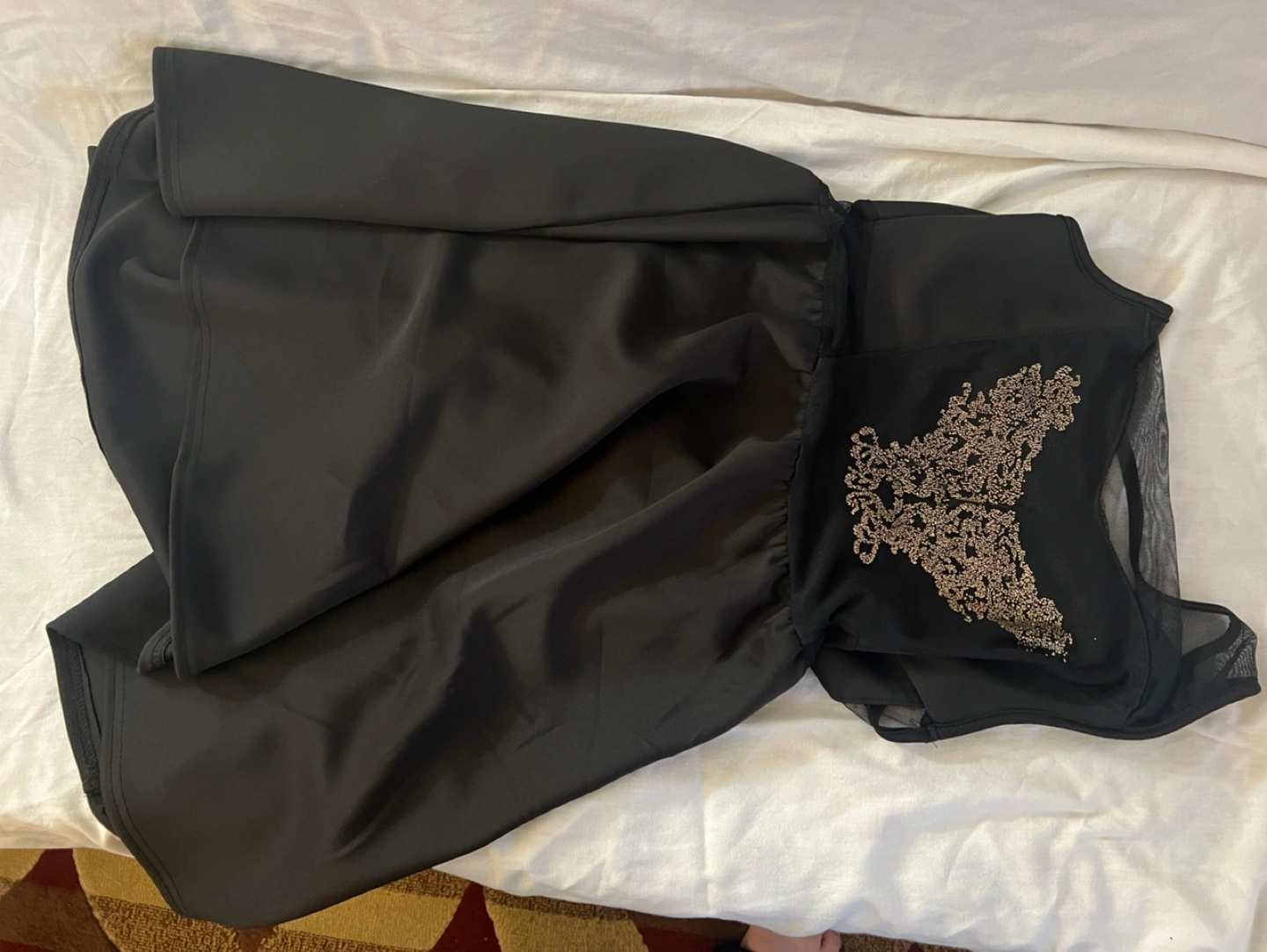 21Black dress with a mesh panel and a beaded design. Sleeveless and fitted with a flared skirt.