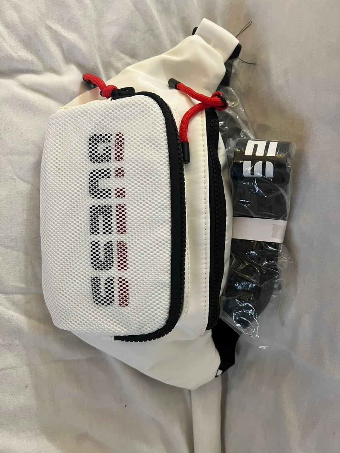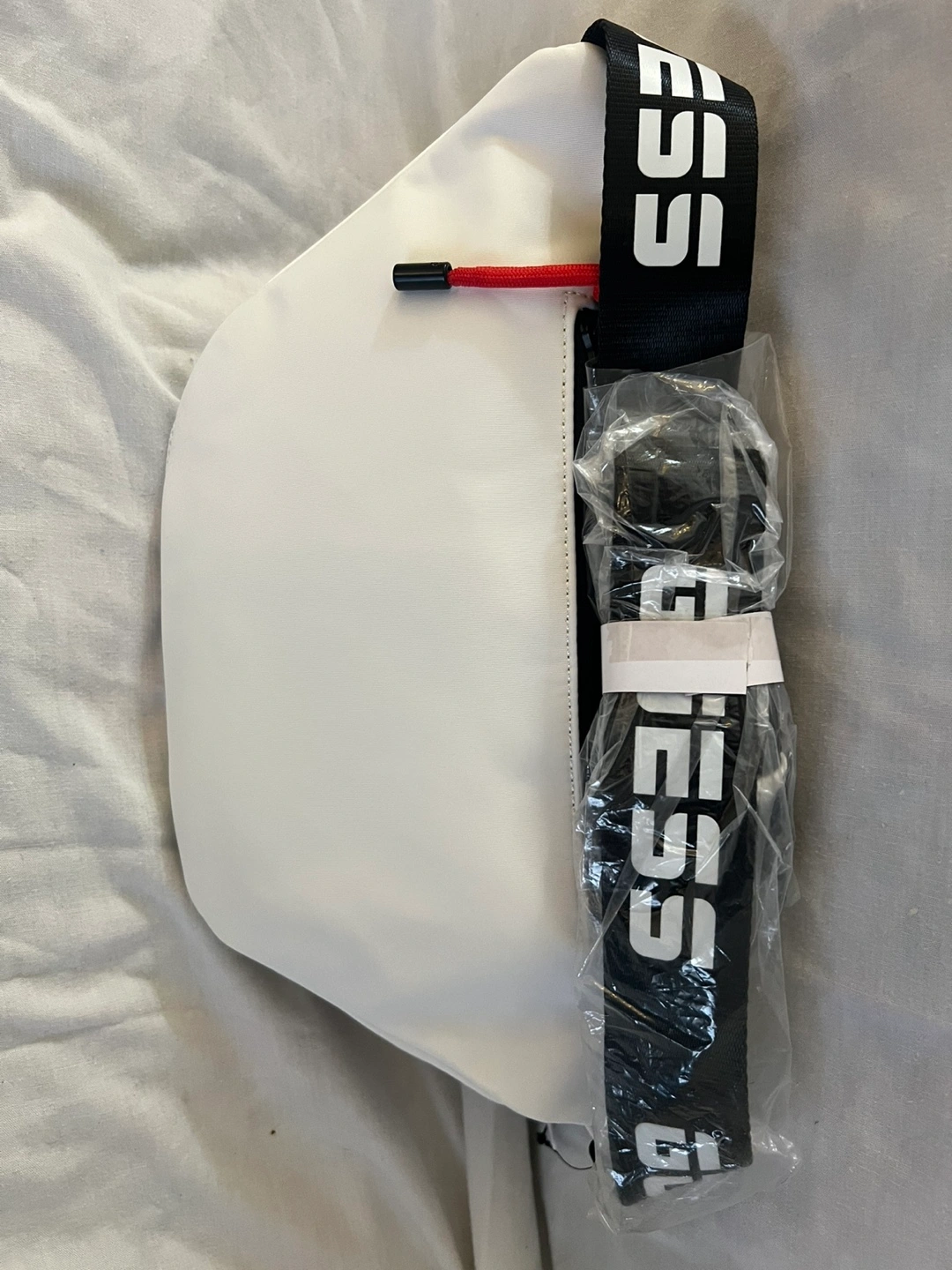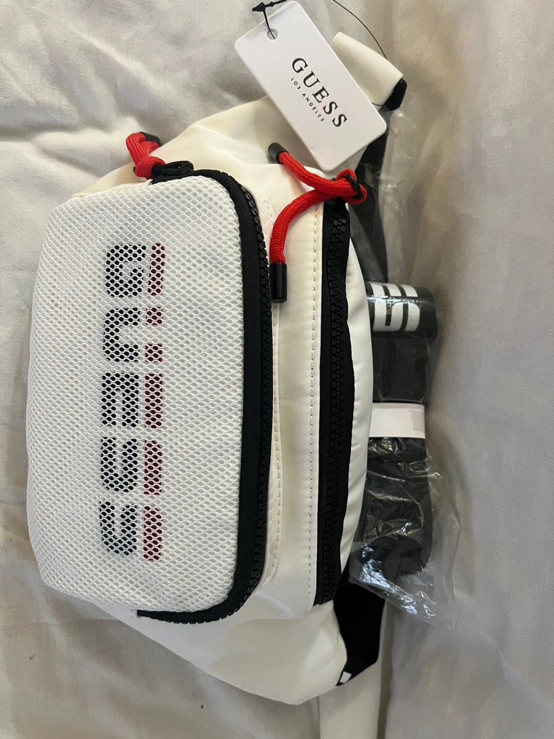 21White fanny pack with a black strap and red accents. Features mesh panel with Guess logo. New with tags.