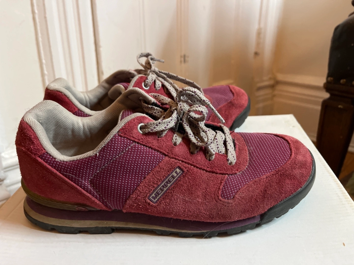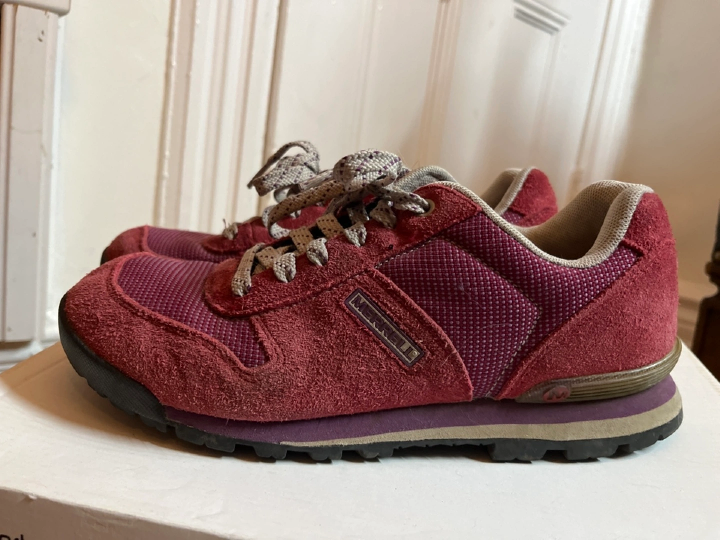 Women's running shoes, deep pinl suede with mesh accents, lace-up, worn 3-5 times, great condition.