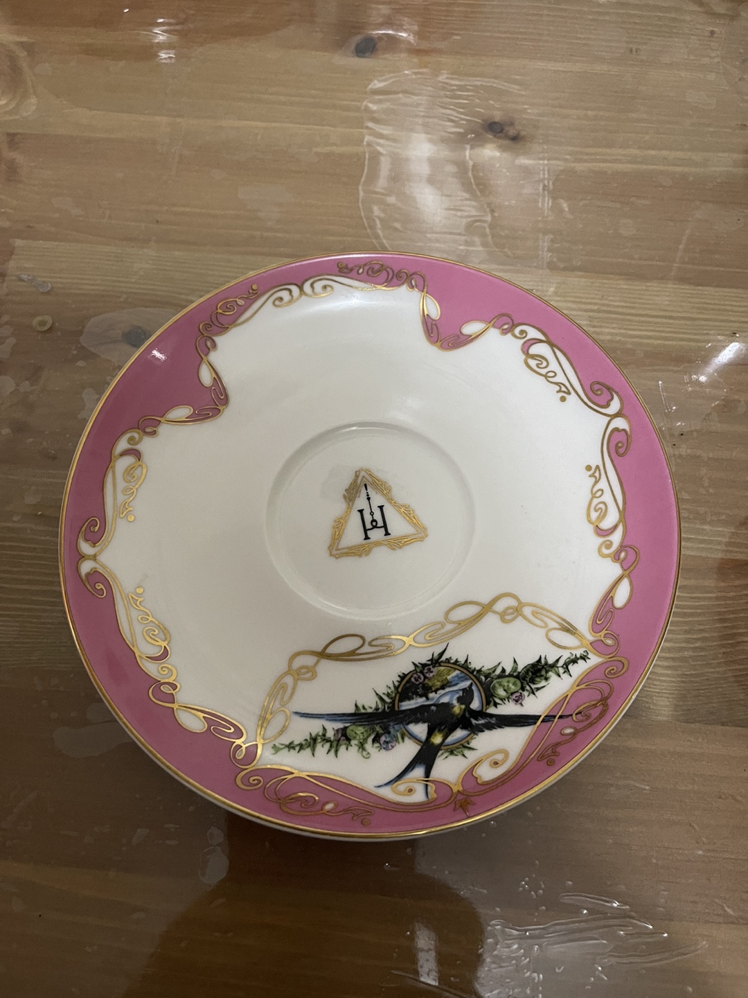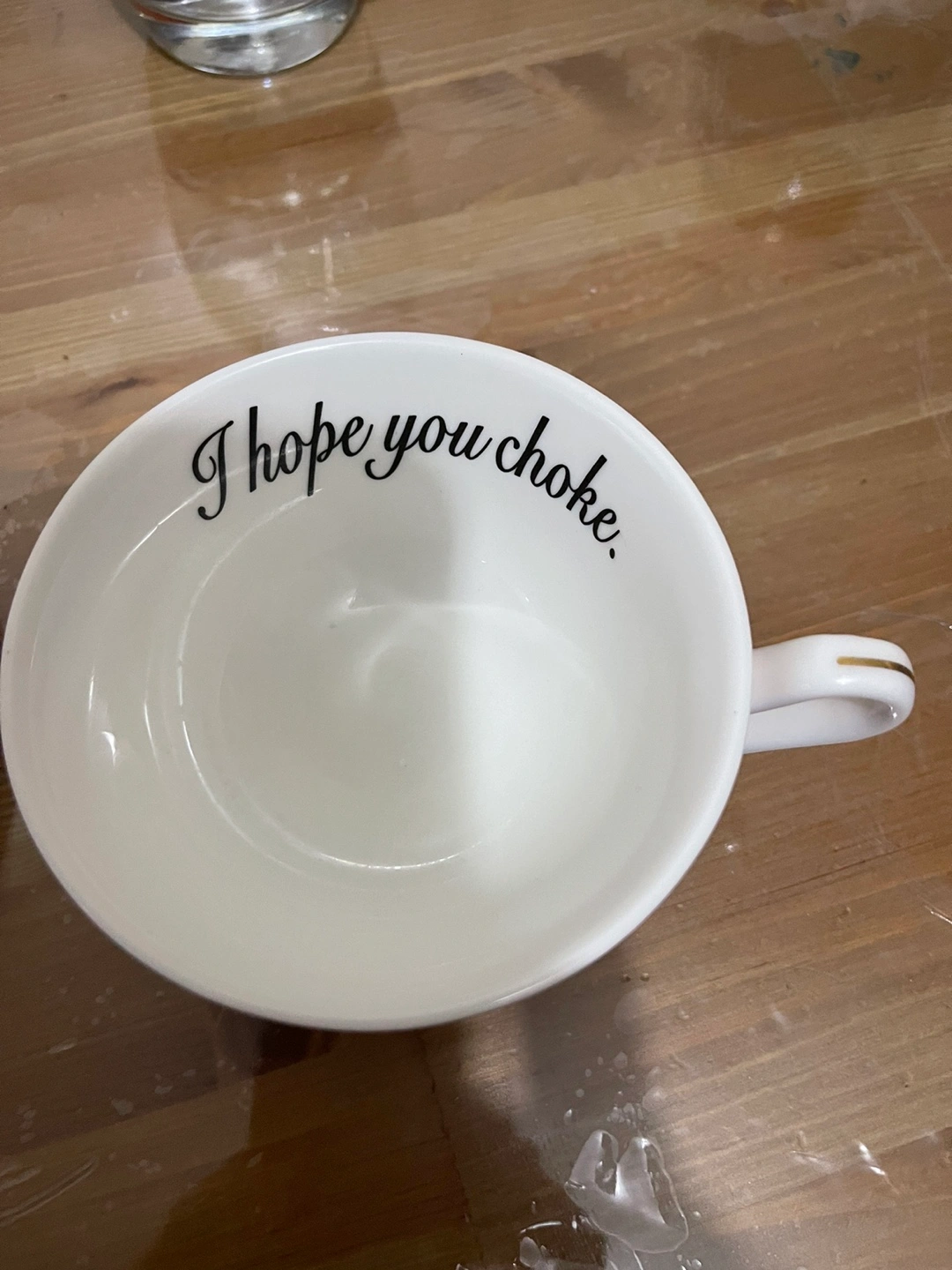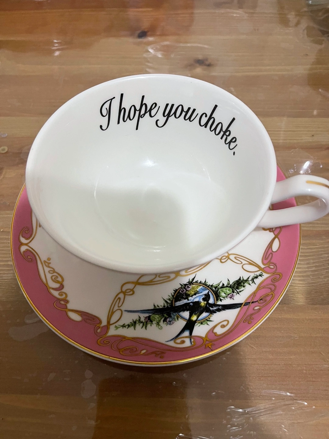 Teacup and saucer set with a pink and gold design. The inside of the cup has the words 'I hope you choke' written on it, to add some fun to your tea time.