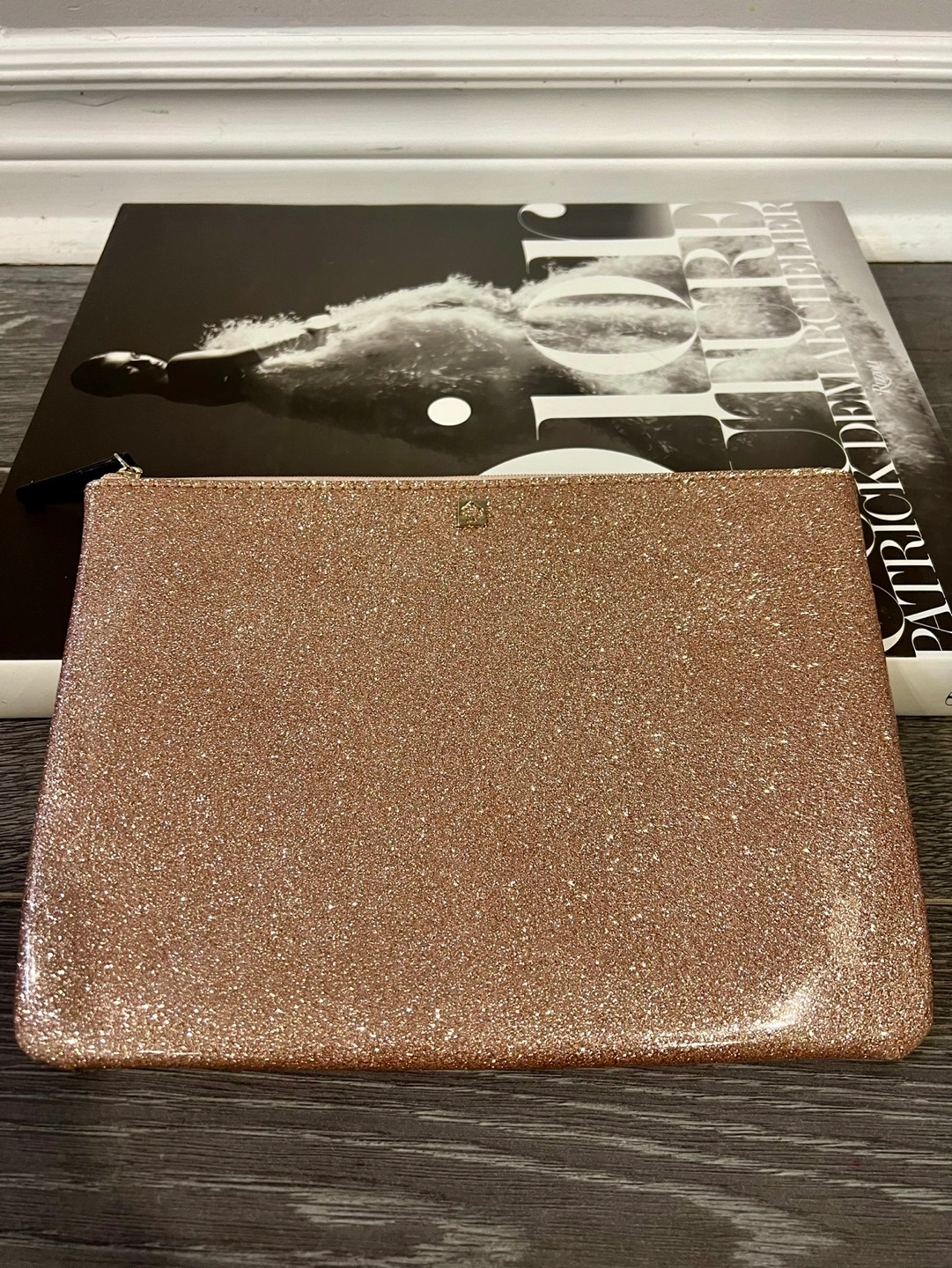 120Rose gold coloured cosmetic bag with a zipper. Made of a shiny, glitter material. Perfect for travel or everyday use.