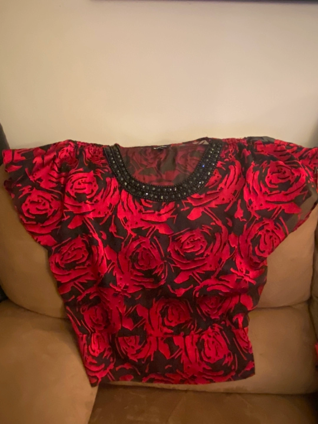 Red and black floral blouse with a beaded neckline. Short sleeves.