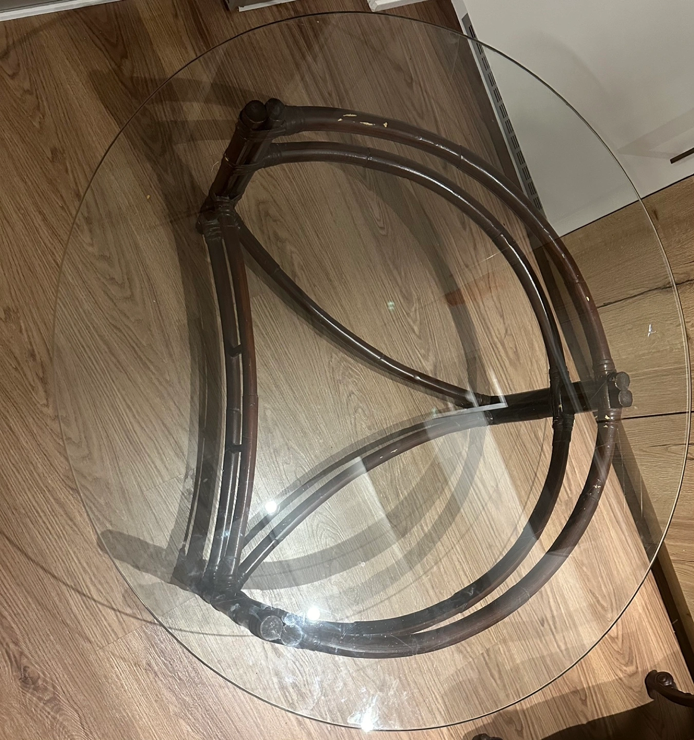 Am giving it away to put a smile on someone’s face. Round glass top coffee table with a unique bamboo frame. The table is in good condition, however, it does show some signs of wear and tear. The glass top is intact, but there are some scratches. The bamboo frame is strong and sturdy.