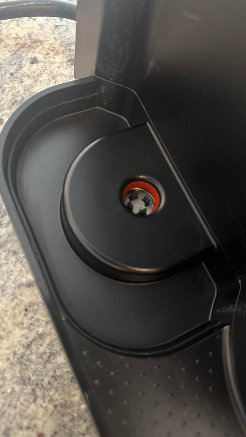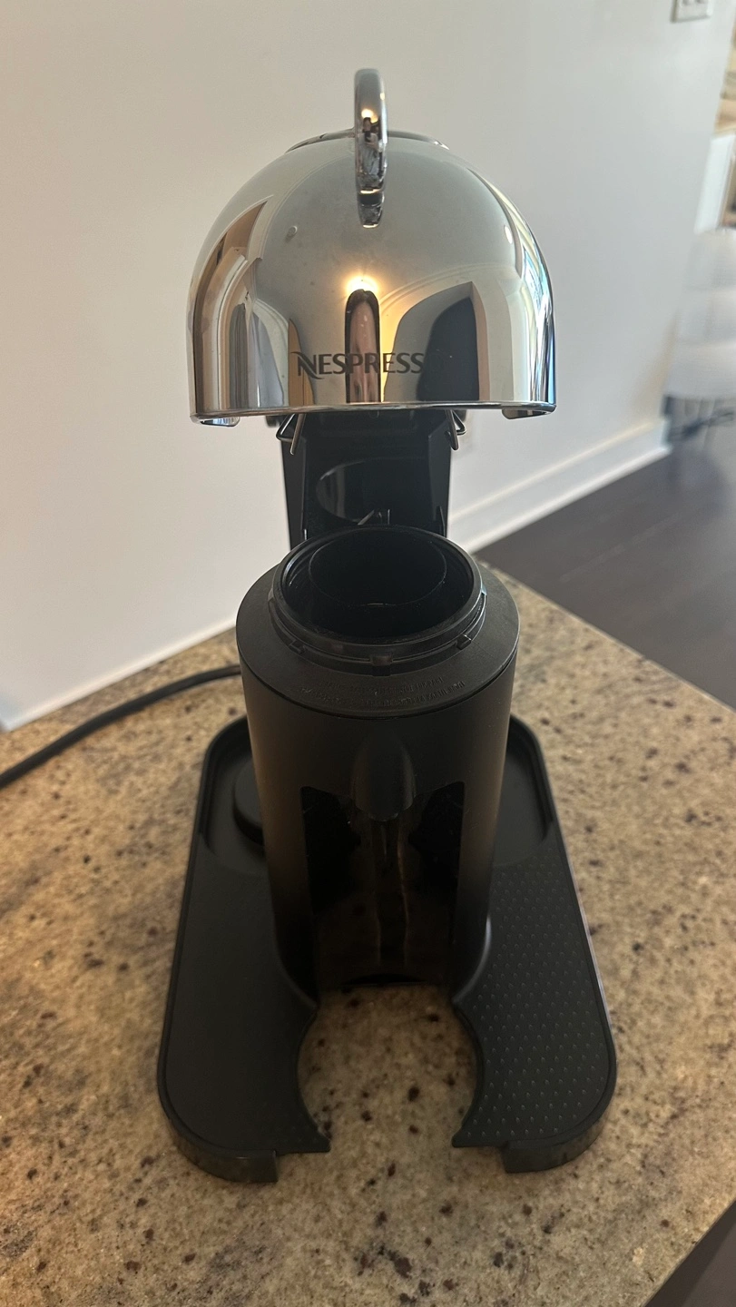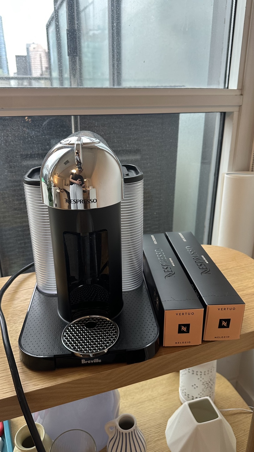 Used Nespresso VertuoPlus coffee machine by Breville. Includes a water tank, used capsule container, and a drip tray. Comes with two pods.