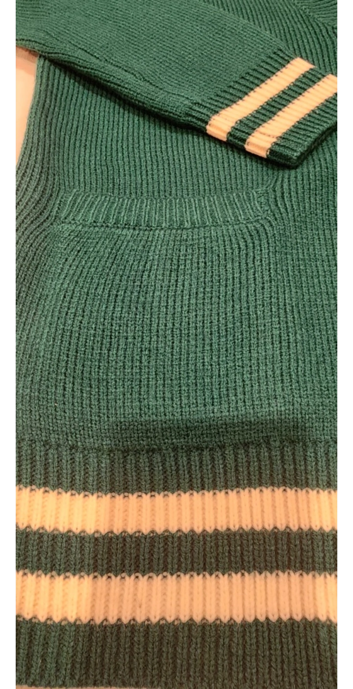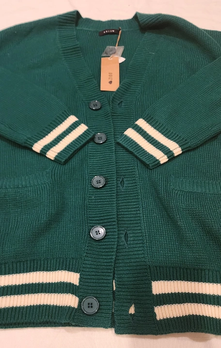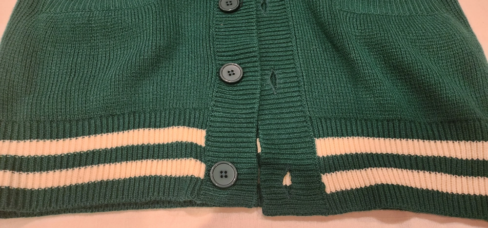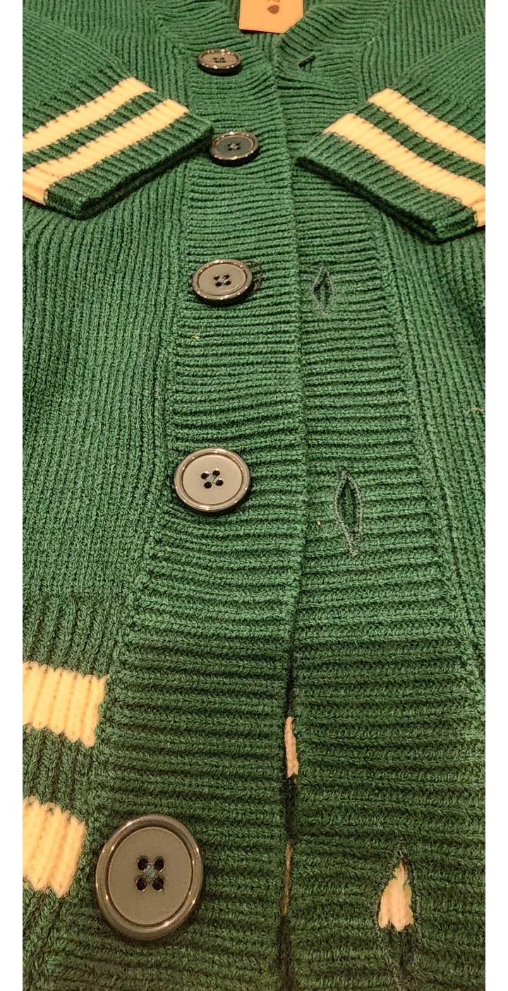 Green cardigan with white stripes on the sleeves and bottom. Button up and pockets on the front.