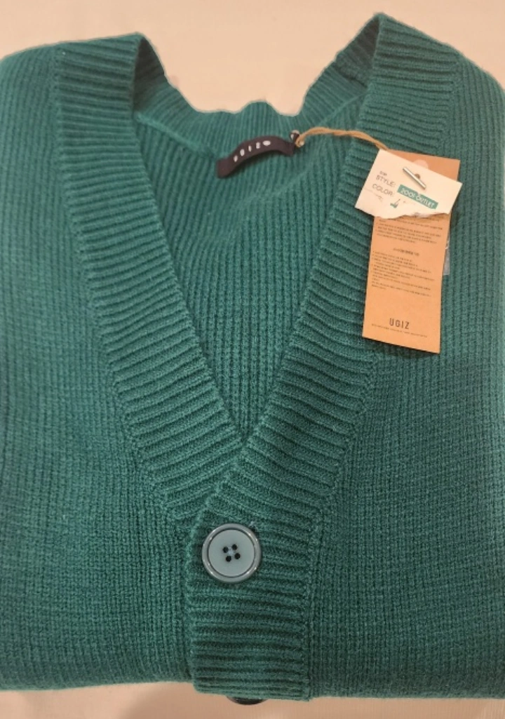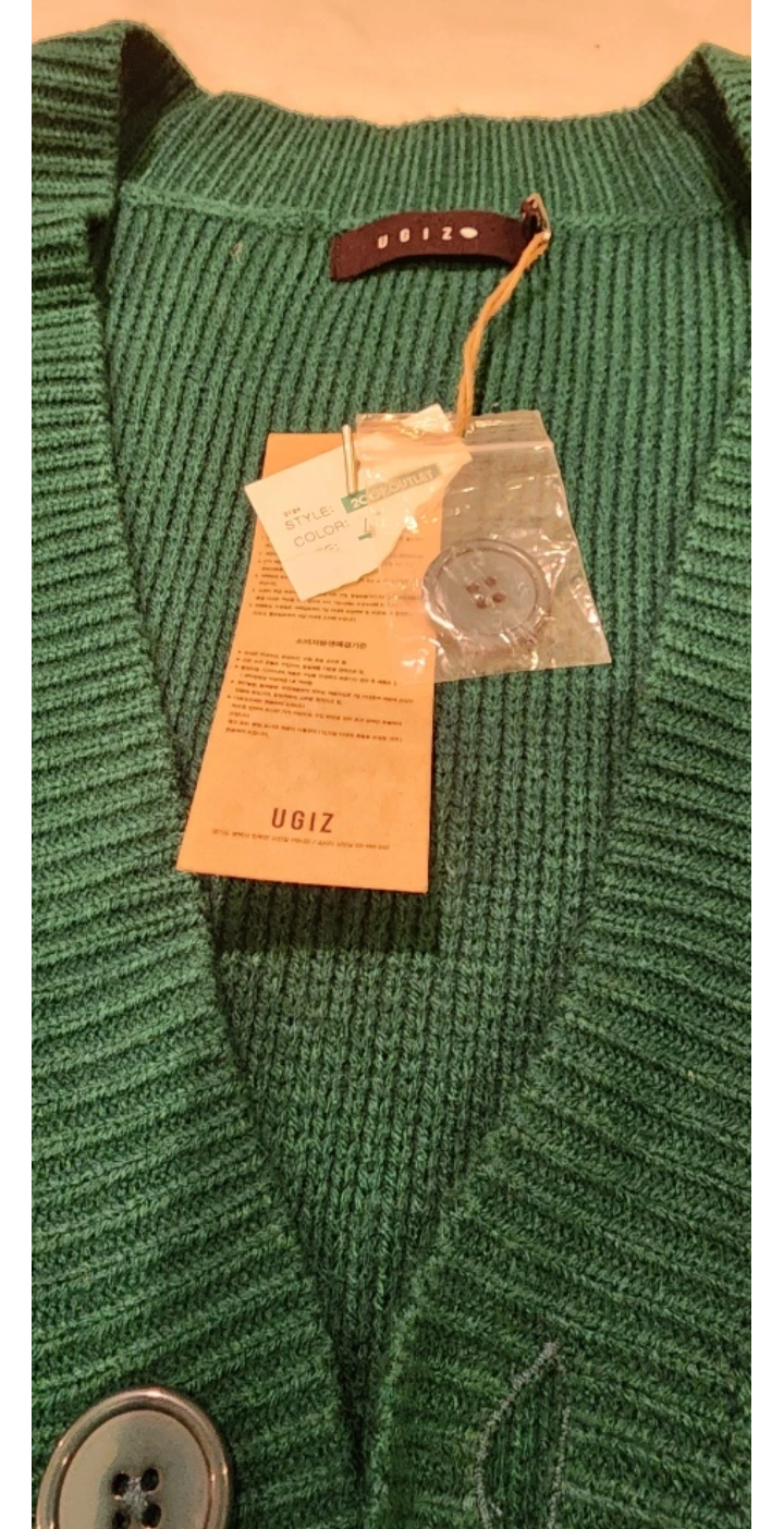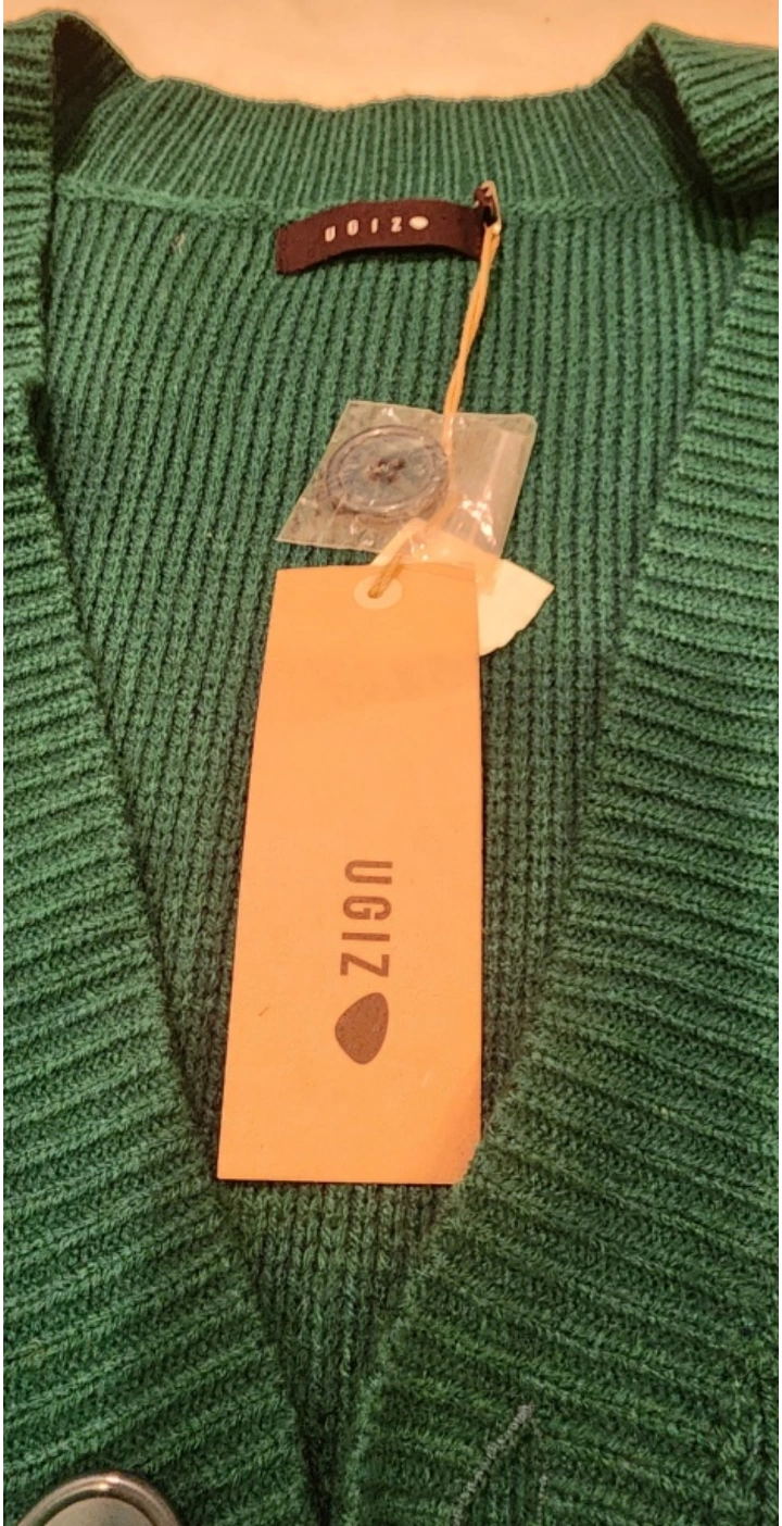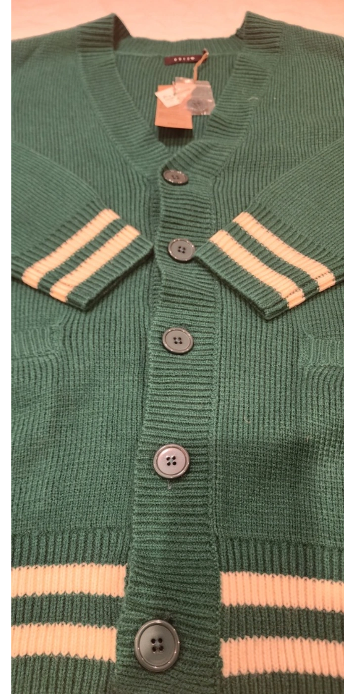Green cardigan with white stripes on the sleeves and bottom. Button up and pockets on the front.