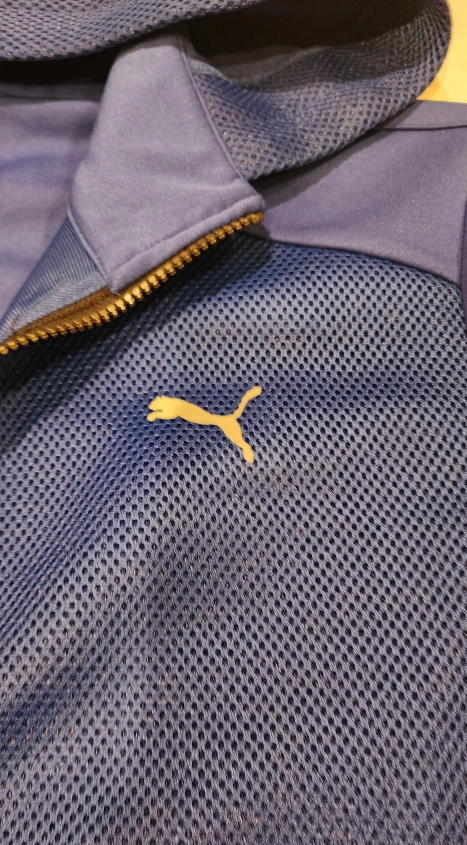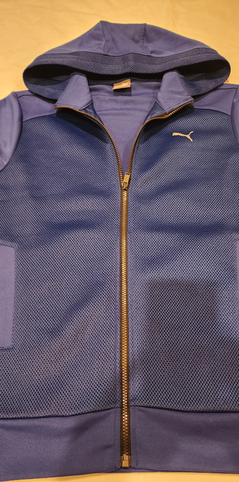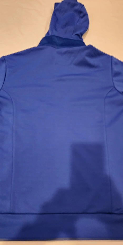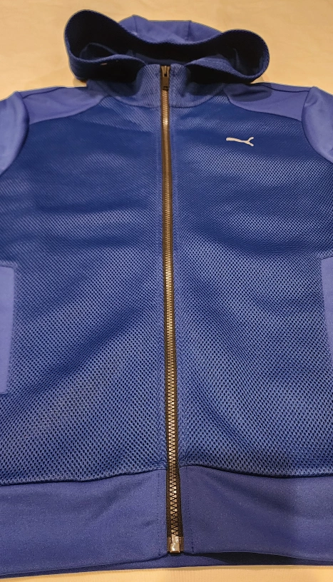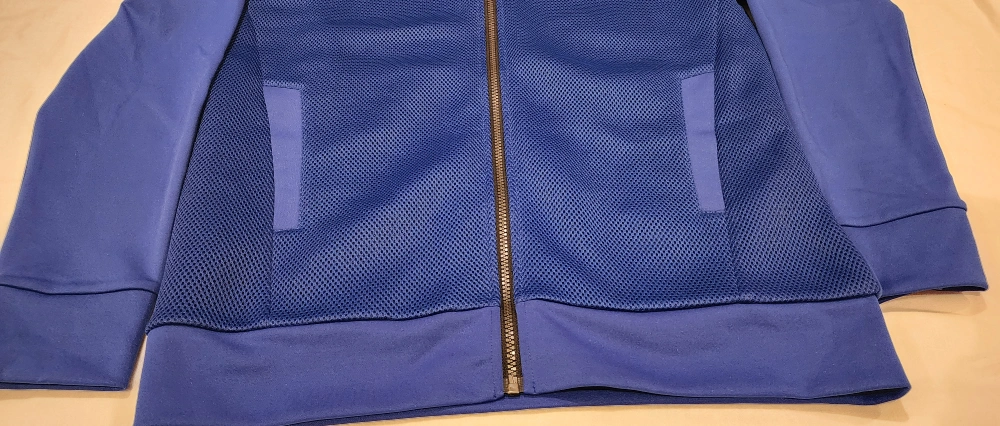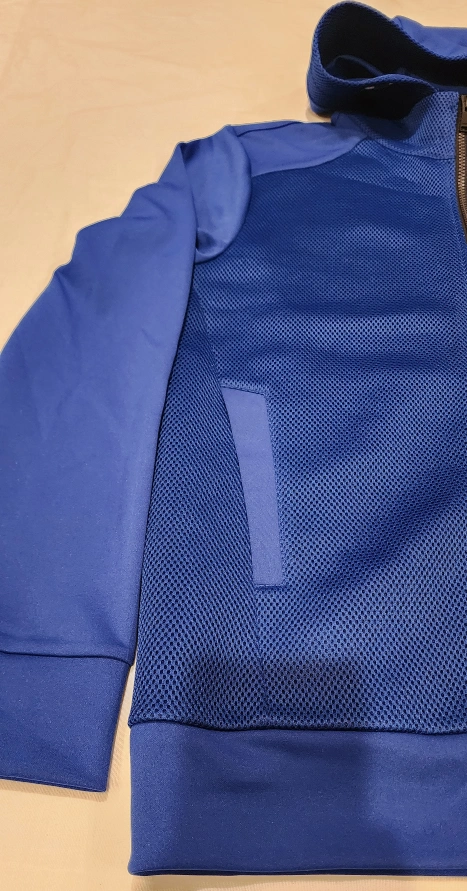 Blue hoodie with mesh panels. Full zip closure and two pockets.