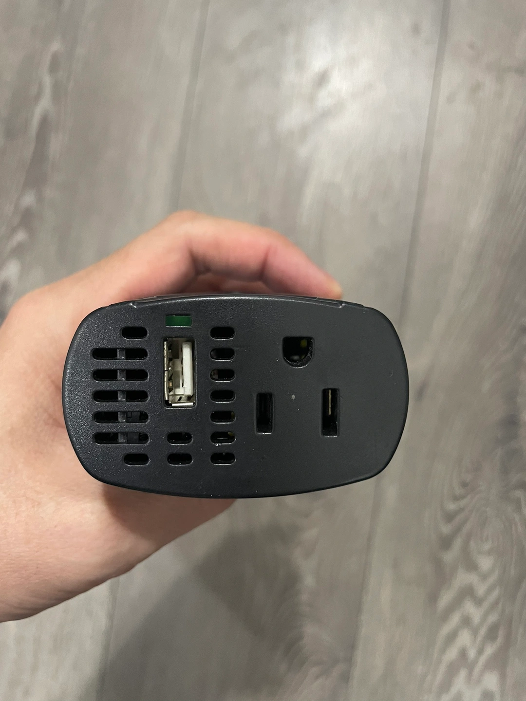 Car charger with multiple outputs including USB-A and cigarette lighter. 75W inverter, mobile power outlet