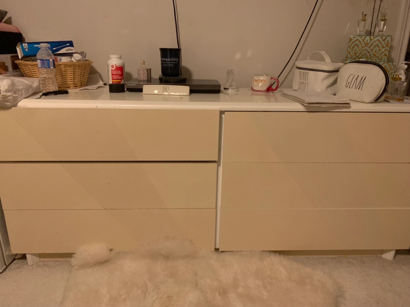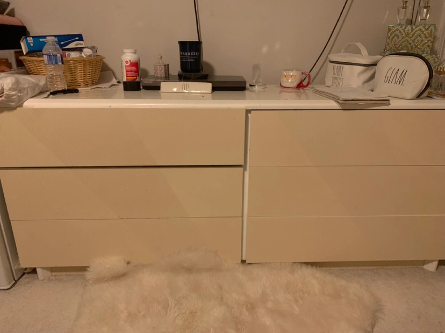 White dresser with 4 drawers. Ok condition. Pick up only. One of the drawers needs to be put in properly. It’s solid wood with lacquer and it also has a matching Chest of drawers which is in excellent condition. Please call me and let me know if you need to come and pick it up you’re gonna need two people