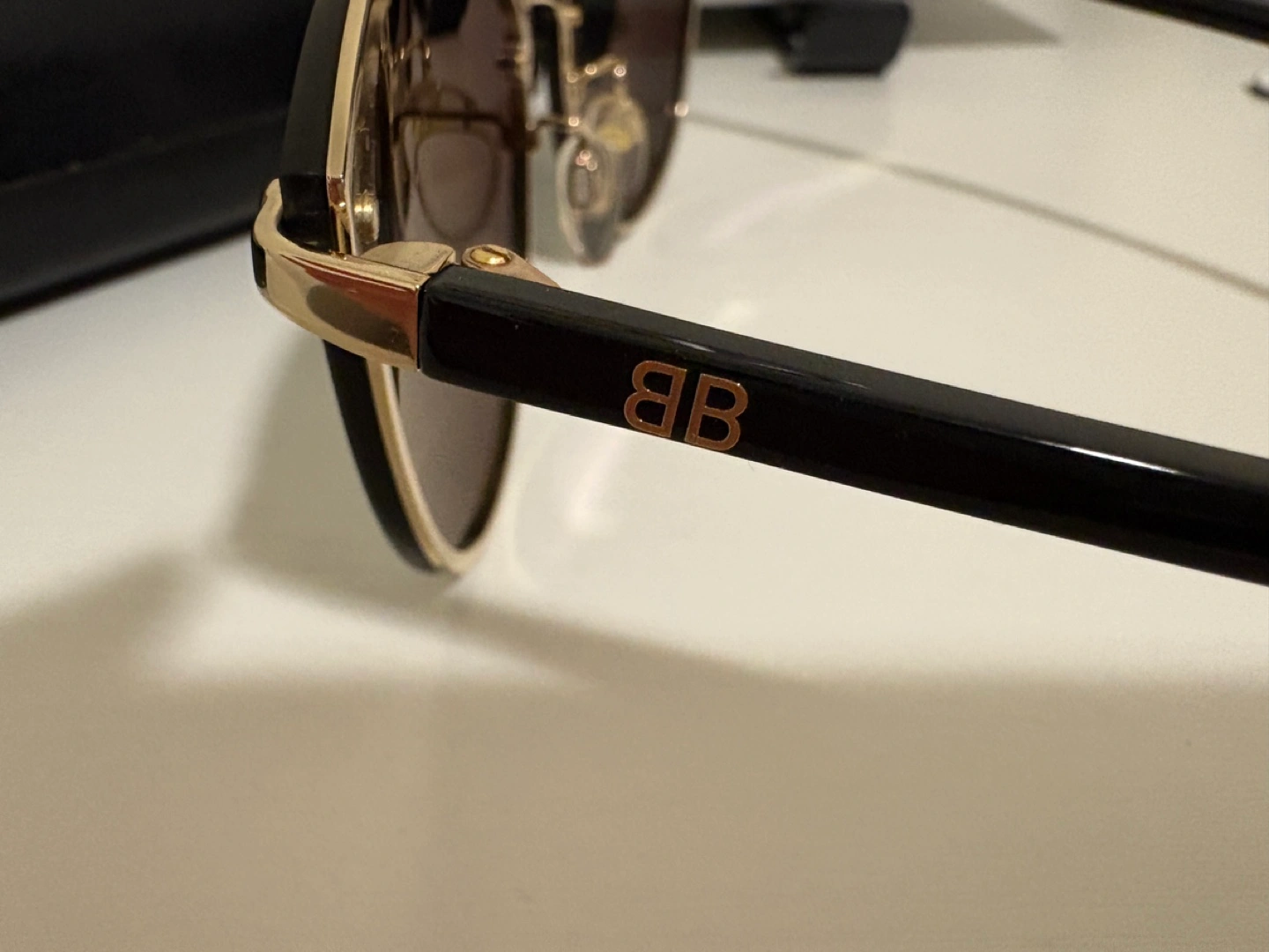 Black sunglasses with gold accents. Come with a black case.
