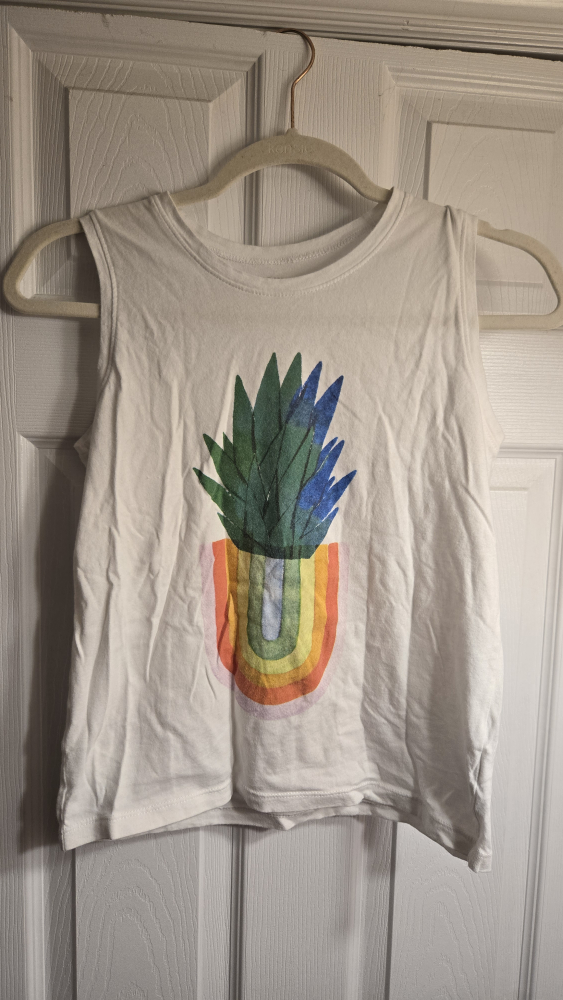 White sleeveless tank top with a pineapple and rainbow graphic. Size XL CHILDRENS (14-16). FITS LIKE AN XS OR S