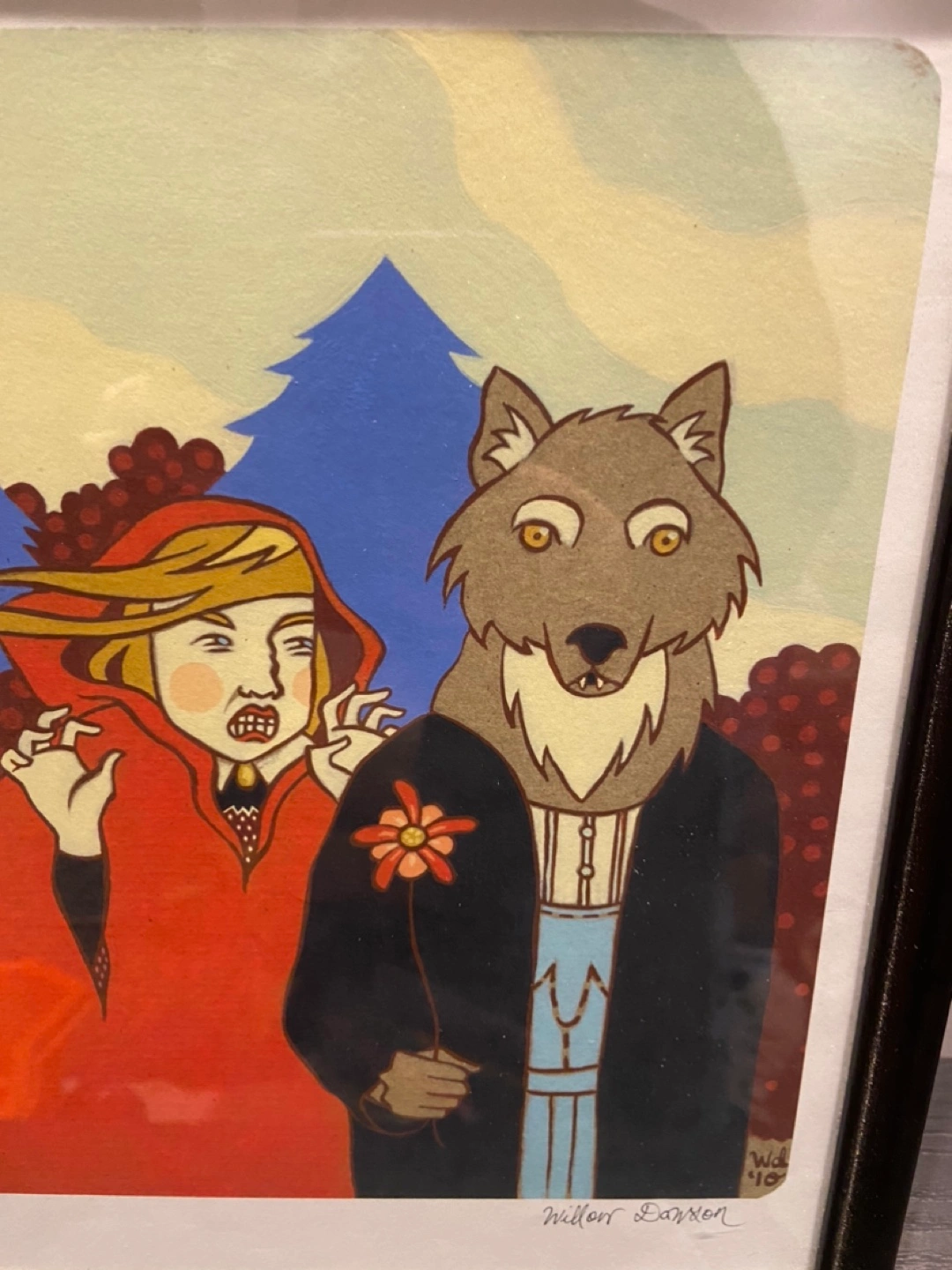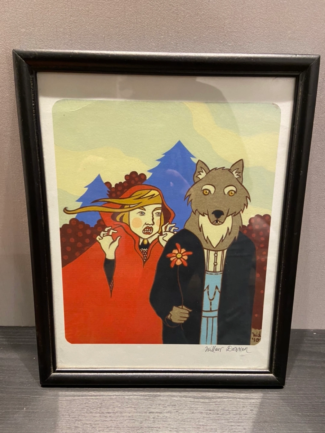 257Framed print of Red Riding Hood and a wolf. Signed by the artist.