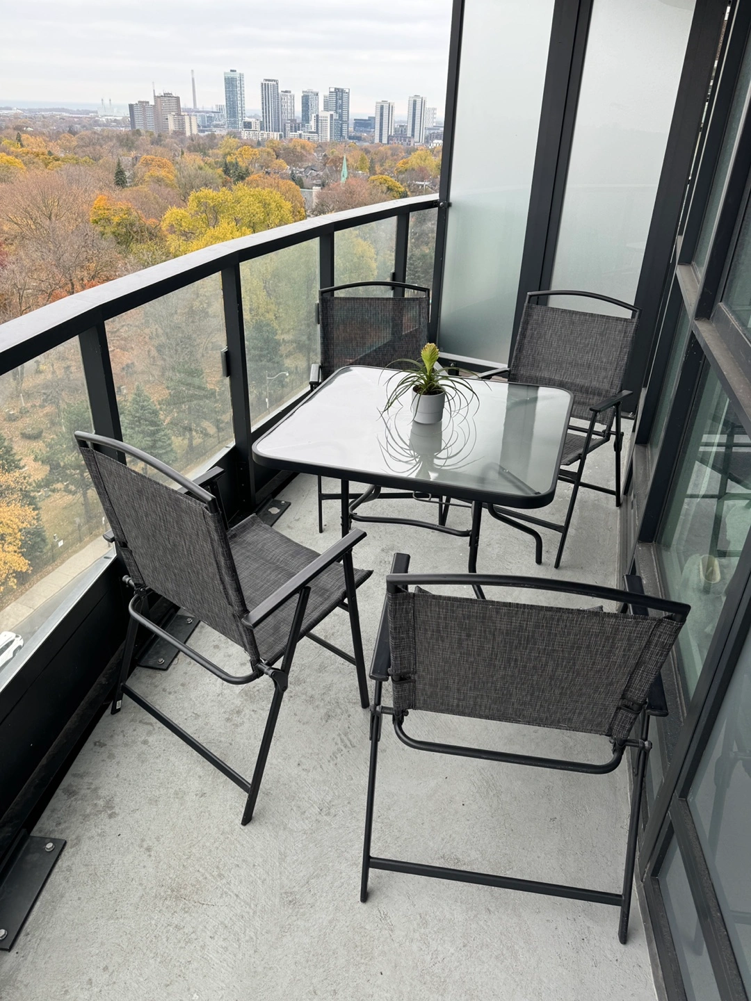 Selling this 6-pieces patio set because I am moving out to a unit without balcony. Includes a never used umbrella. Great and sturdy set. Does not stain overtime. Like new condition. Table is 33.5 x 33.5 inches. Pick up in Cabbage Town.