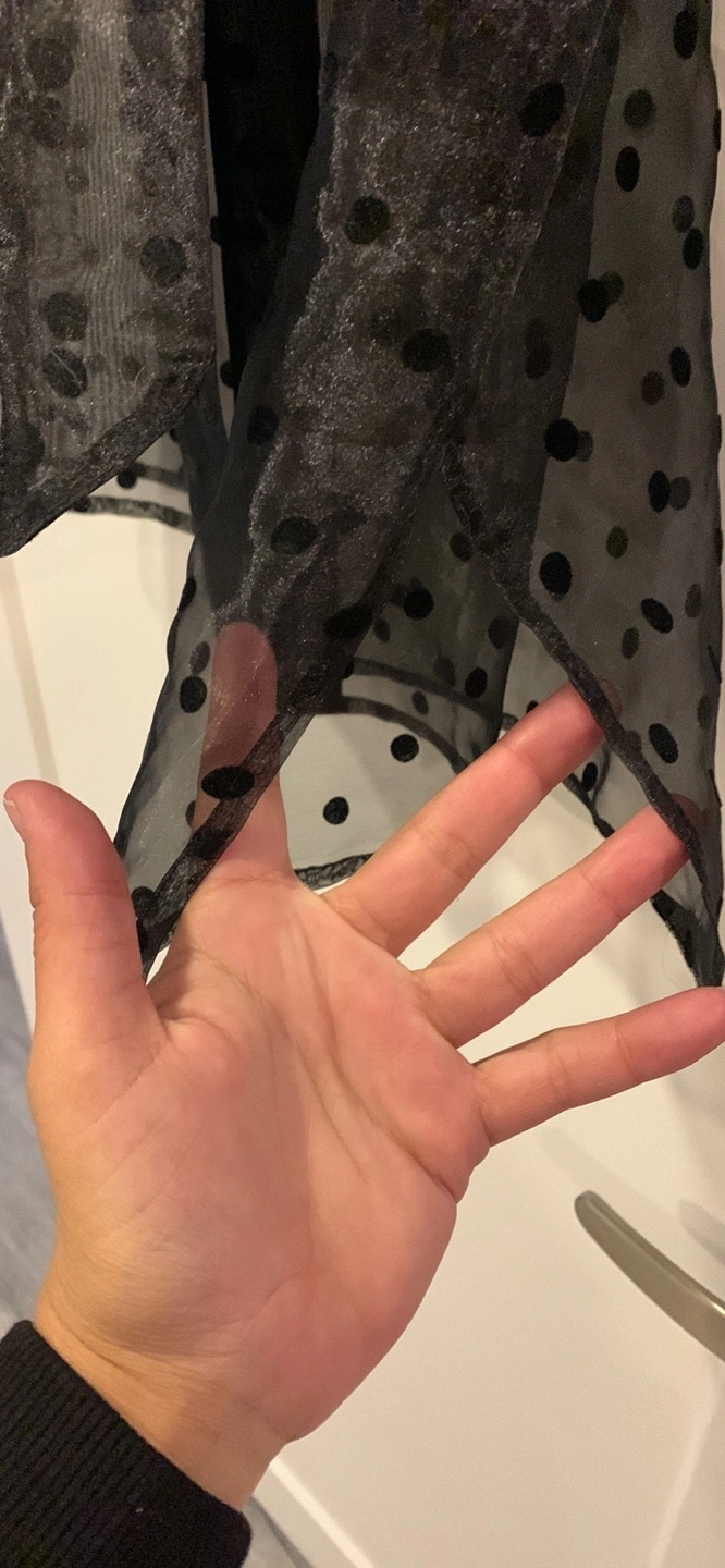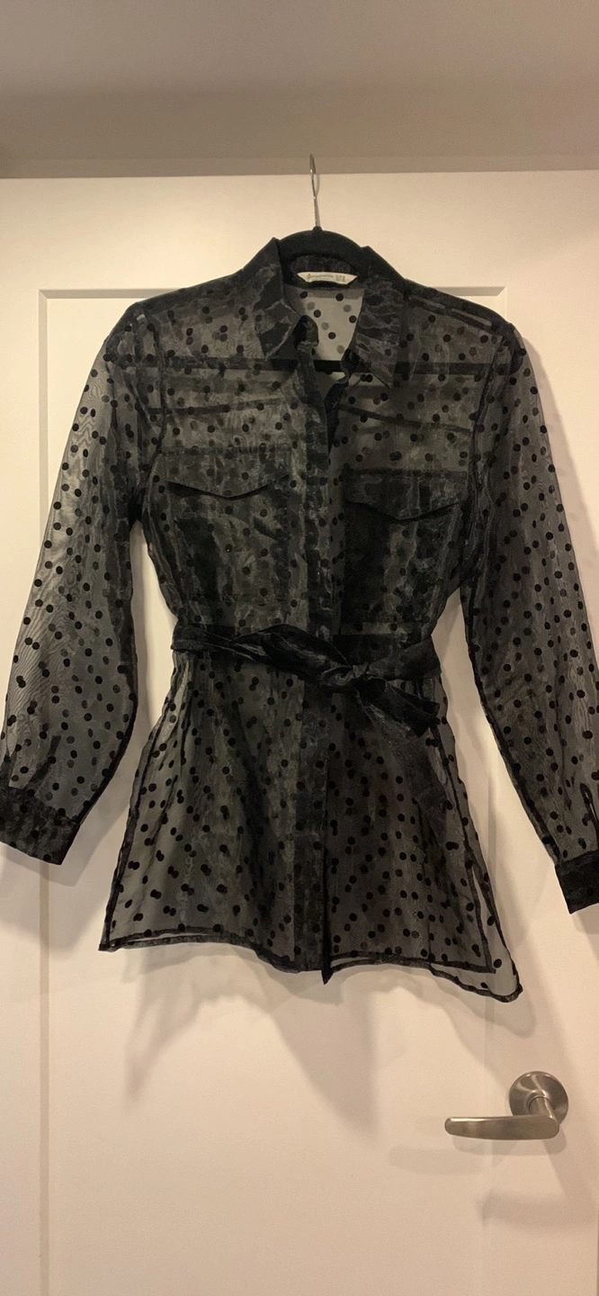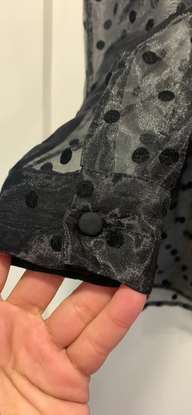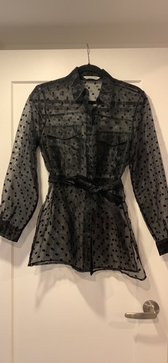 Used once . Black sheer blouse with polka dots. Has a tie at the waist. Long sleeves. Size Medium.