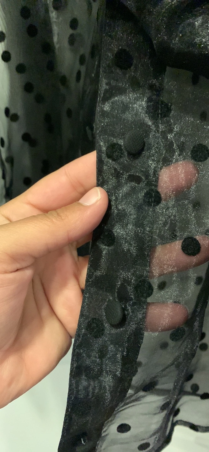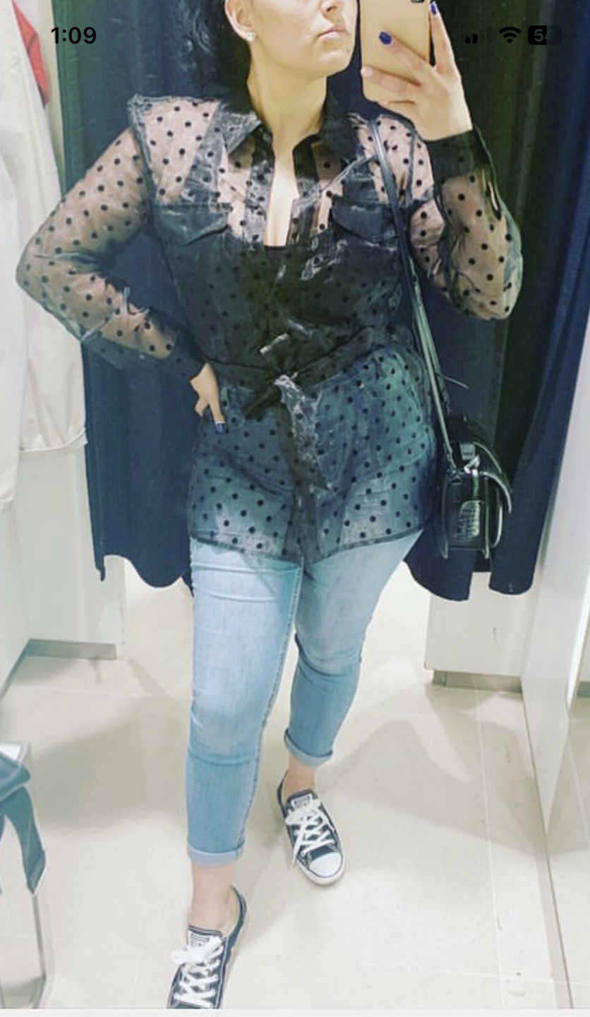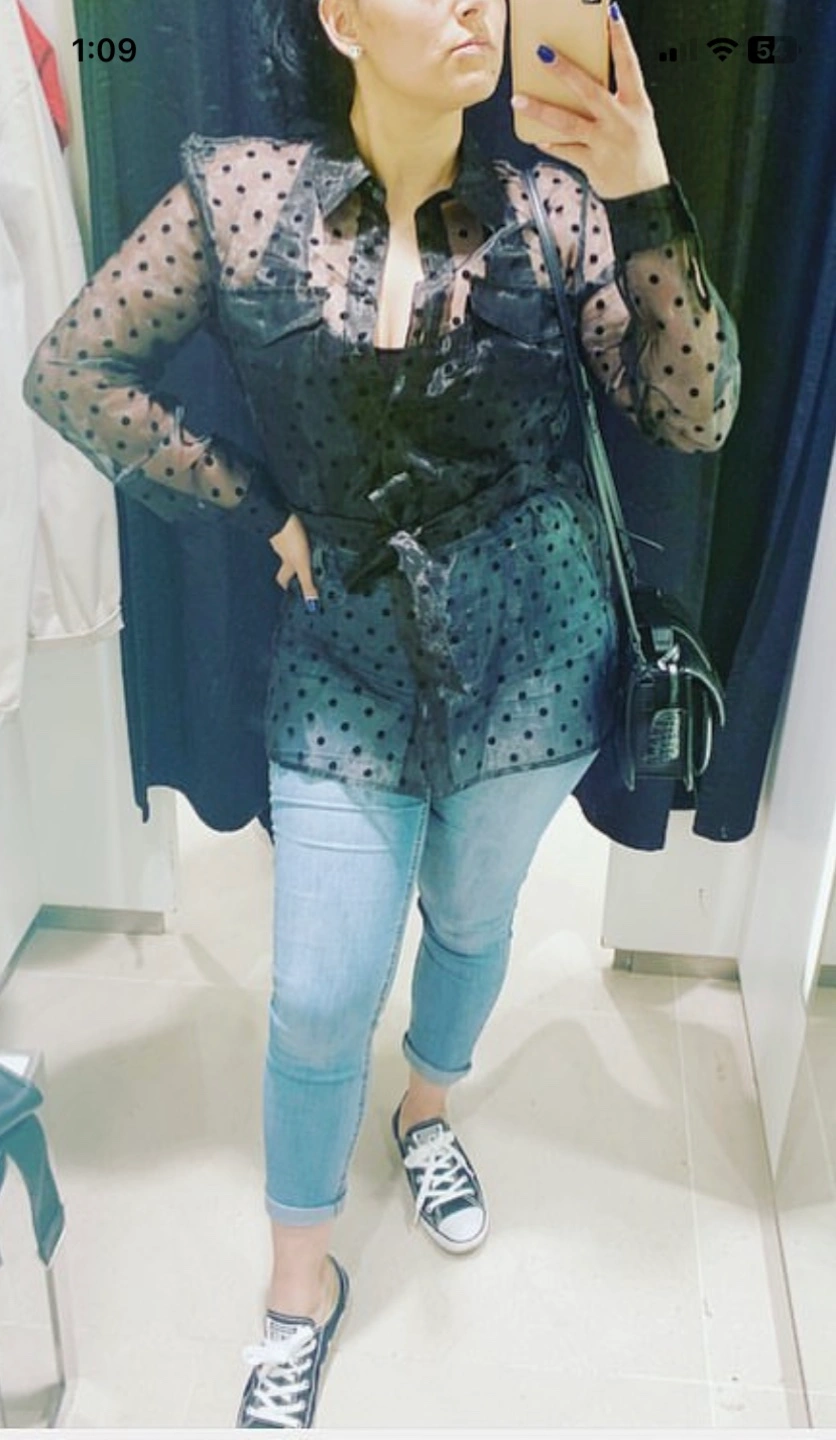 Used once . Black sheer blouse with polka dots. Has a tie at the waist. Long sleeves. Size Medium.