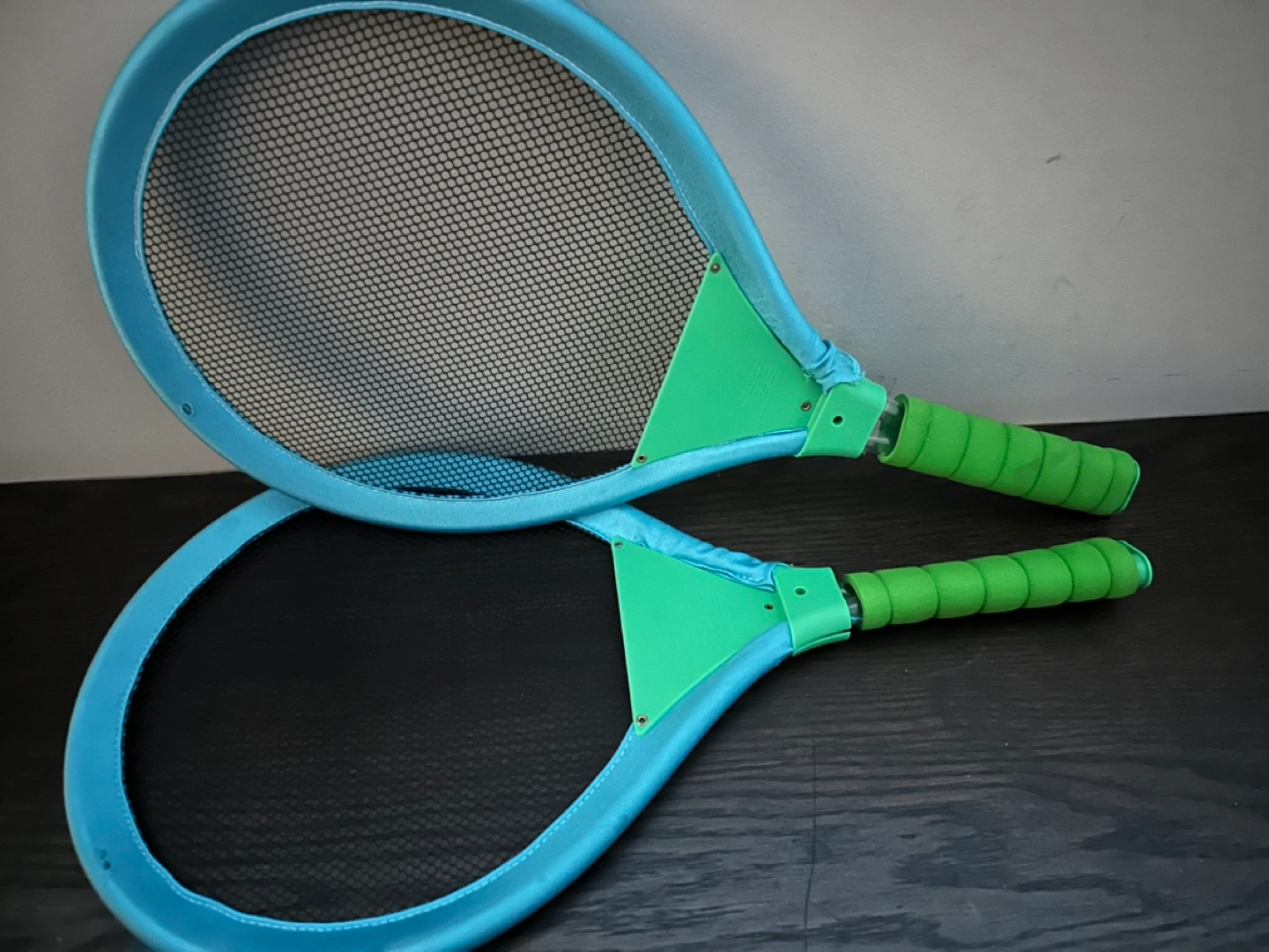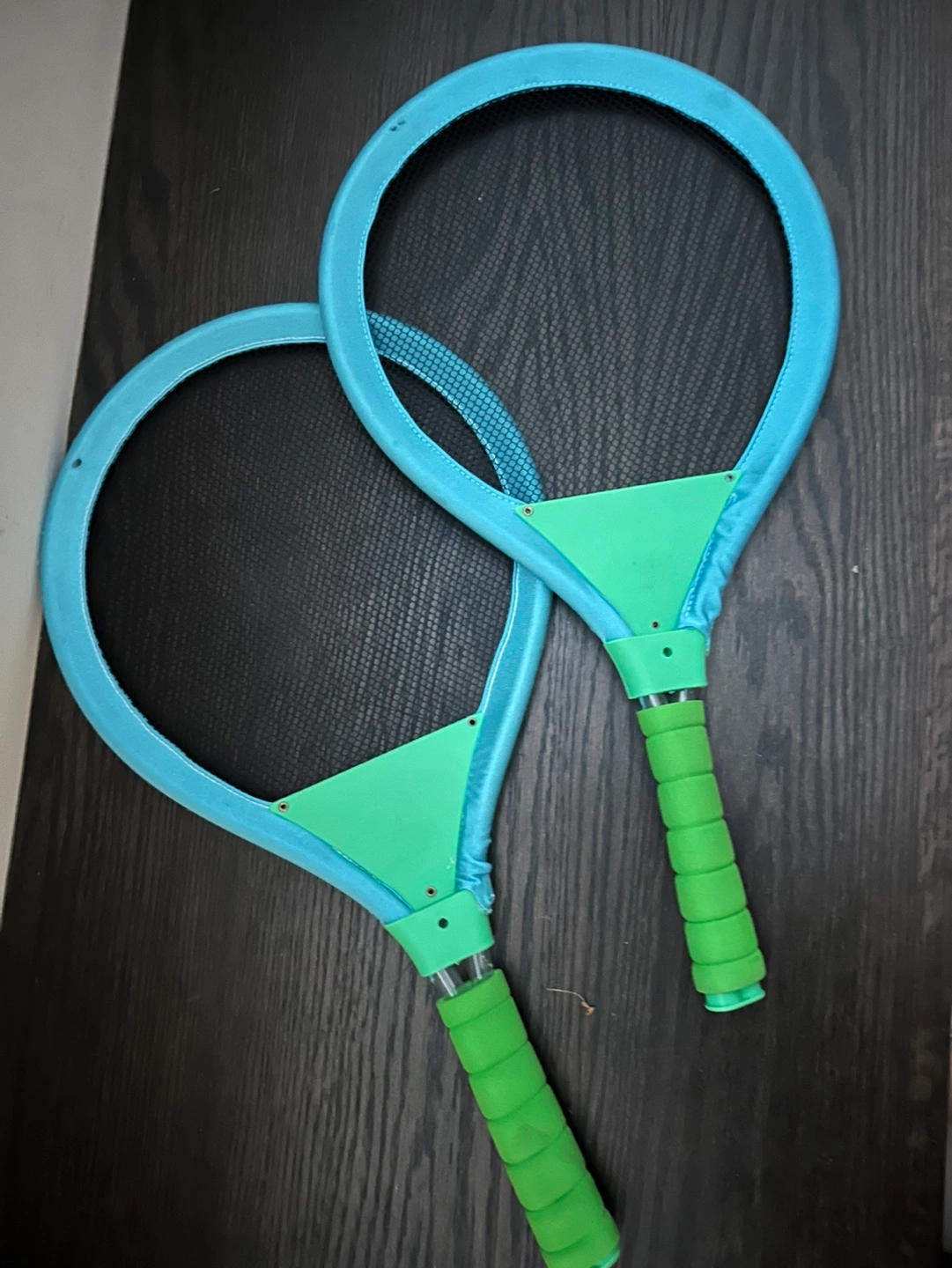 486Two blue and green tennis rackets. Good for a fun game of tennis in the backyard.