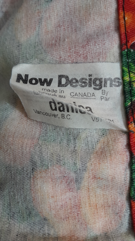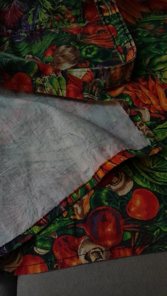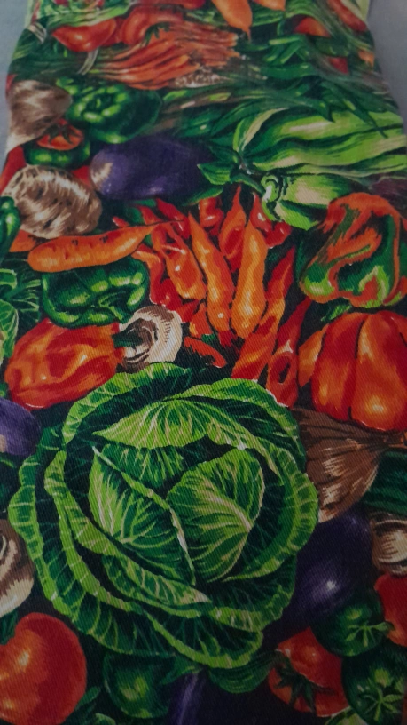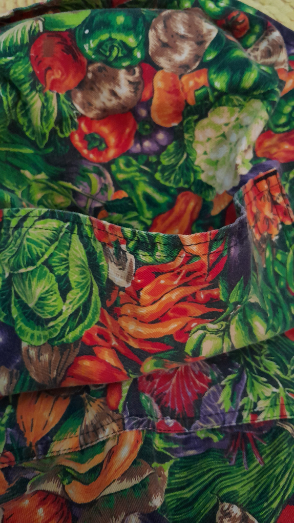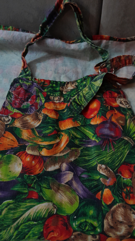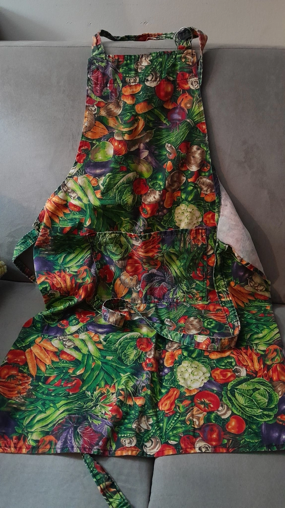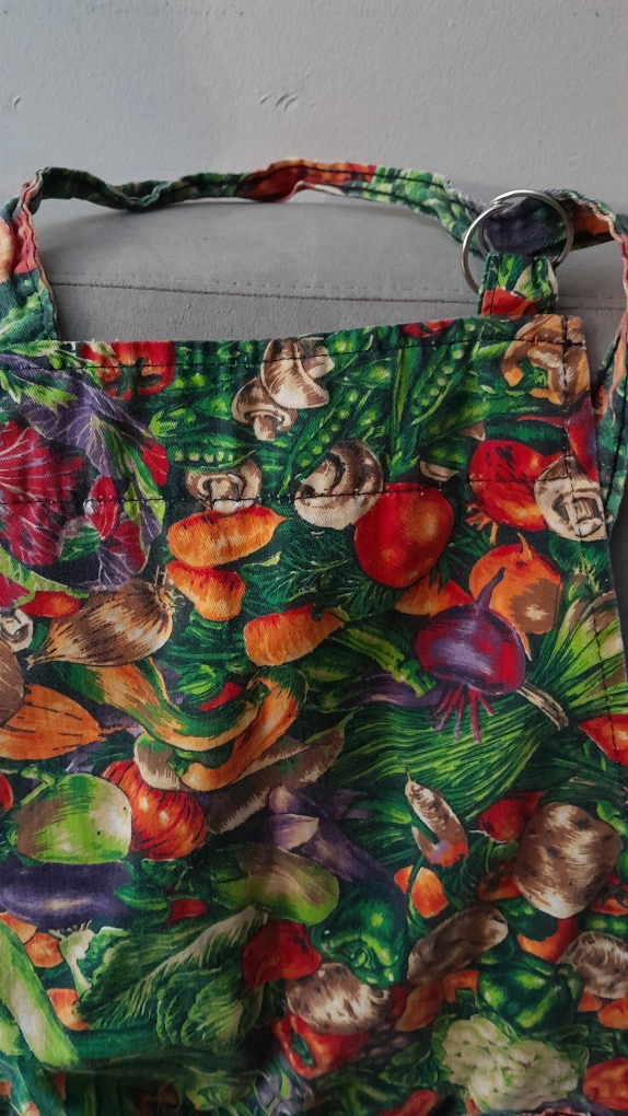 Apron with colourful vegetable print, front pocket and adjustable straps.
