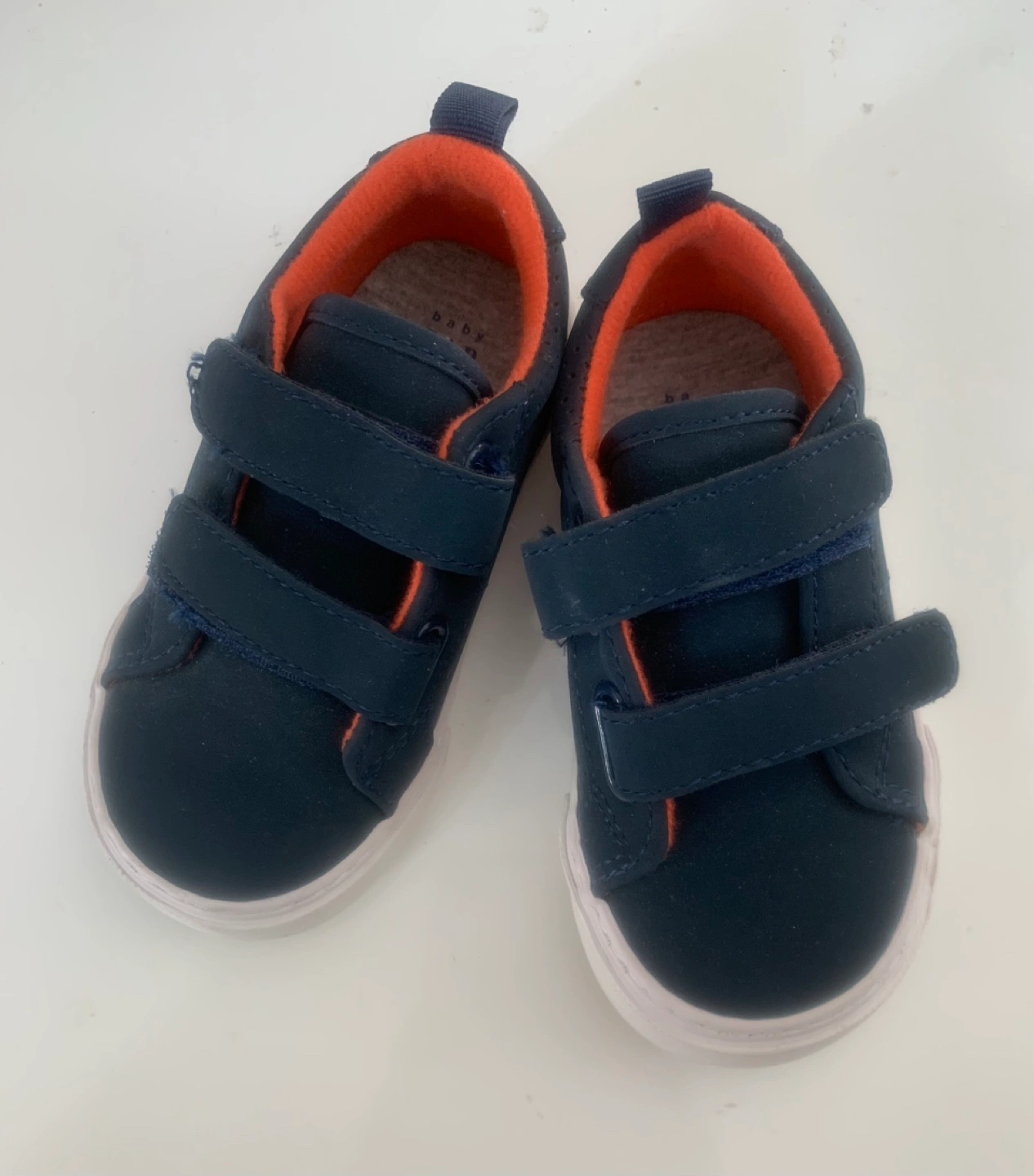 Blue sneakers with orange accents. Two velcro straps for easy on and off. White sole. Size 6
