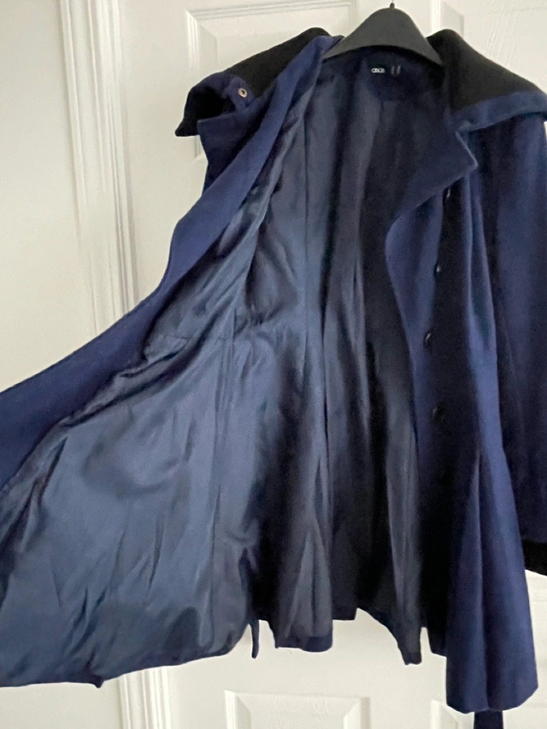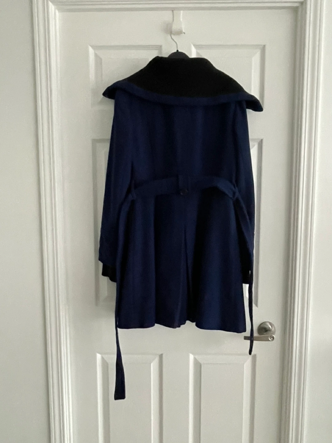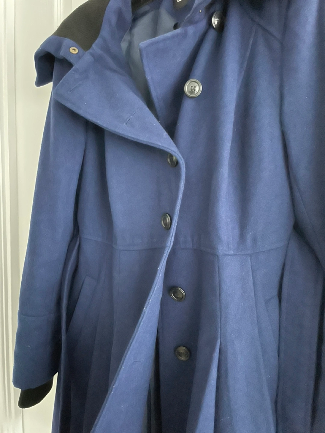 Cobalt blue wool-blend coat with a belt. The coat has a black trim on the collar and sleeves and a pleated bottom. Fully lined.