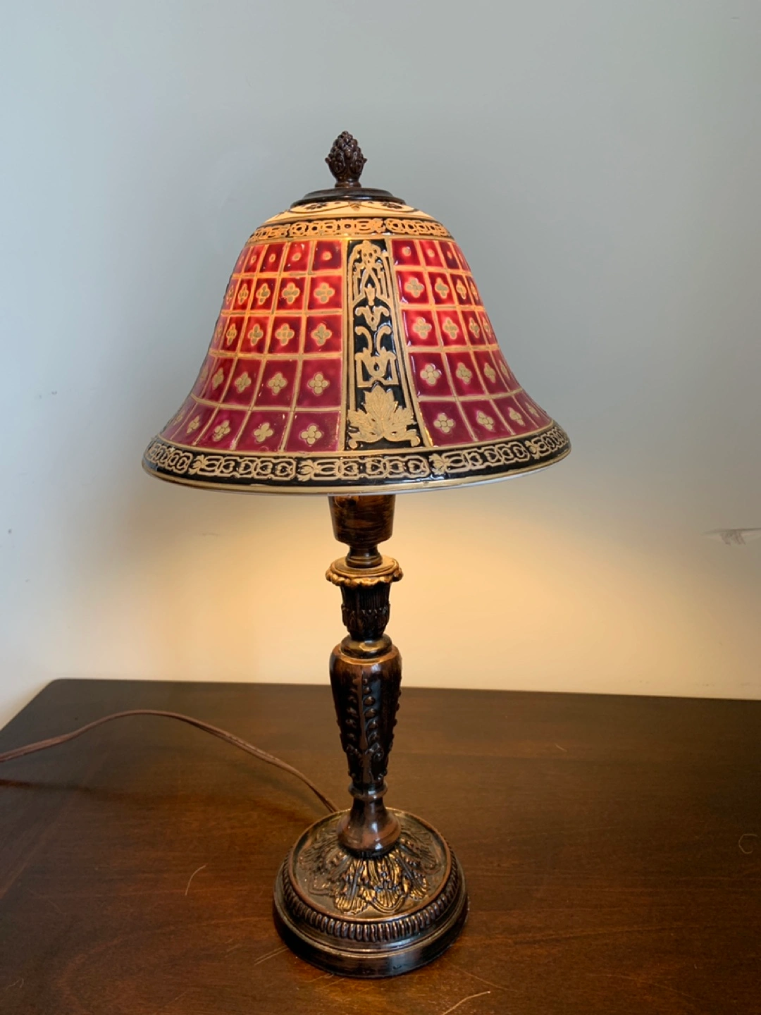 Ornate table lamp sold metal with a ceramic shade with a floral design. The shade is red, black, and gold. The lamp is in good condition. H19”. W 10