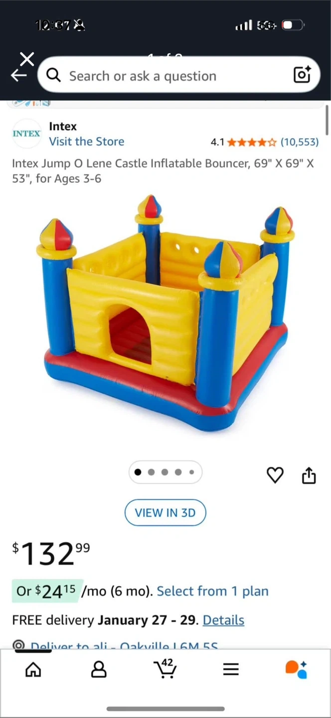 Intex Jump-O-Lene Castle Bouncer for ages 3-6. It measures 69" x 53" x 53". This inflatable castle is a fun way for kids to play indoors or outdoors!
