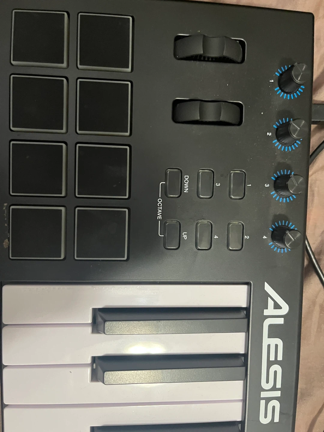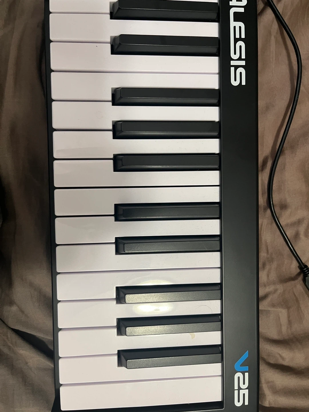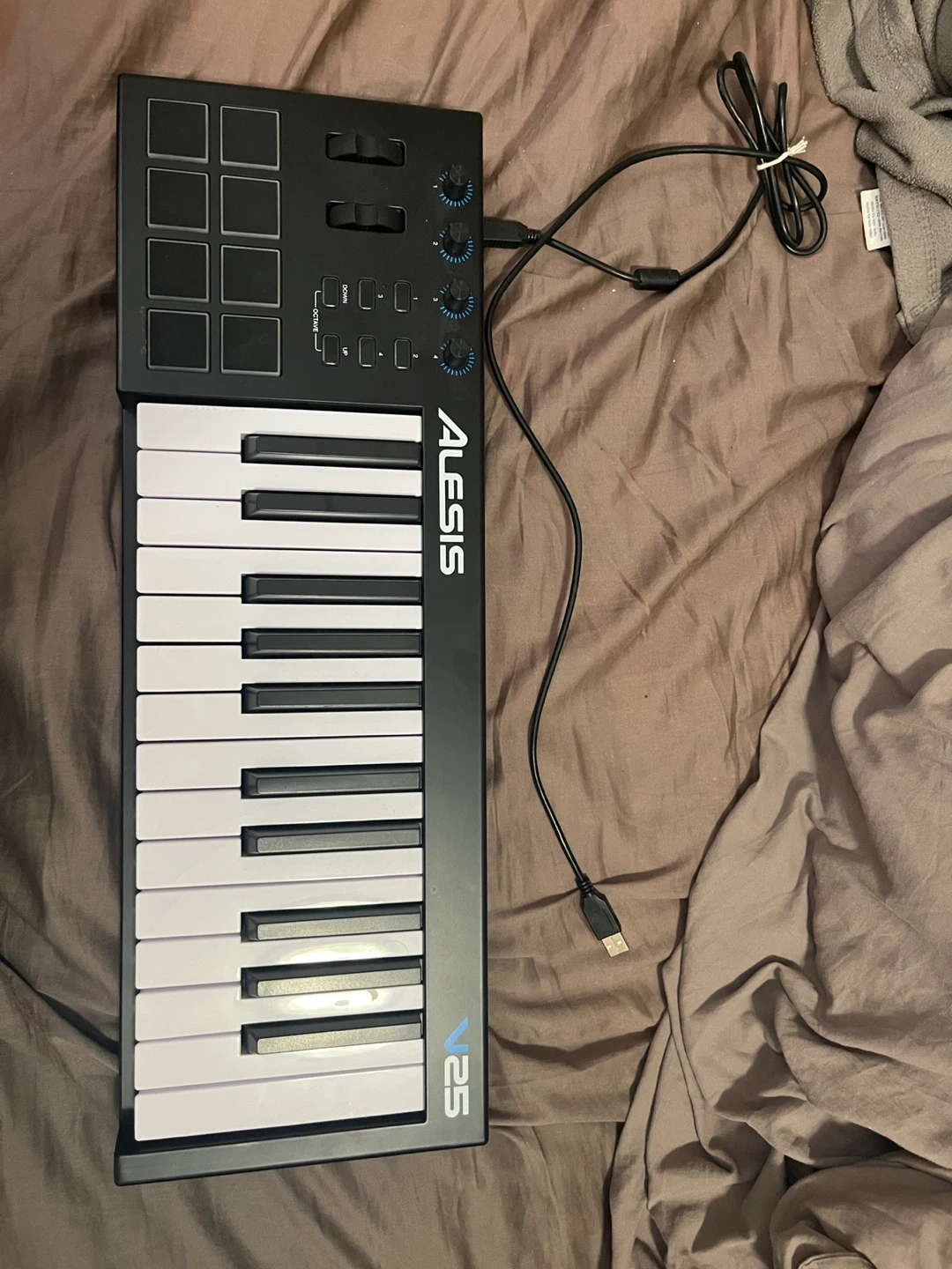 This is an Alesis V25 25-key USB MIDI keyboard controller. It features velocity-sensitive keys and eight drum pads. It also includes assignable knobs and buttons for controlling software. It's great for music production.