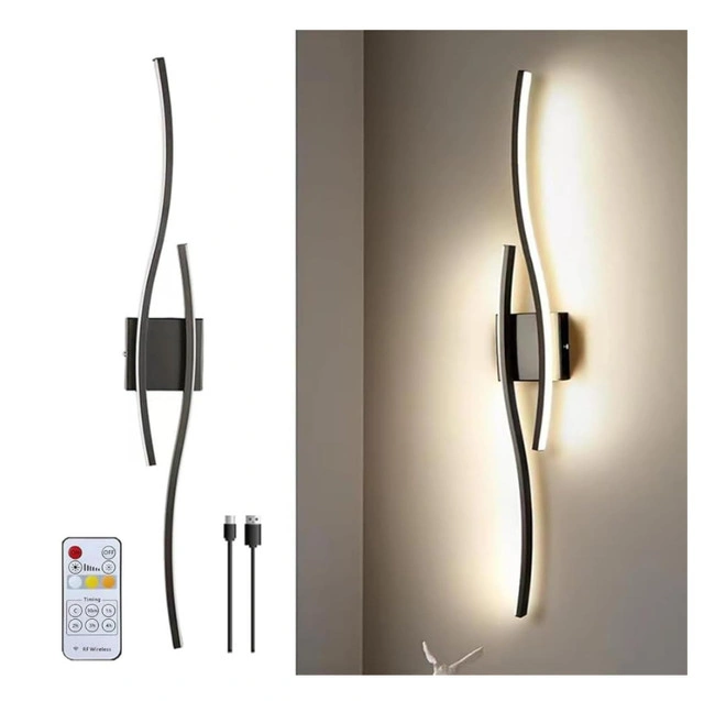 LED Wall Light USB Rechargeable | Wireless, Dimmable, Remote-Controlled Wall Sconce – Black (Wave Design)