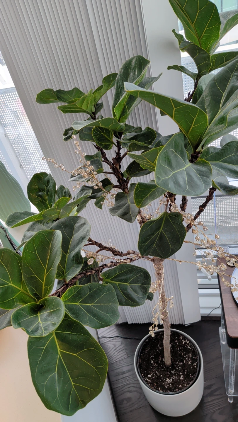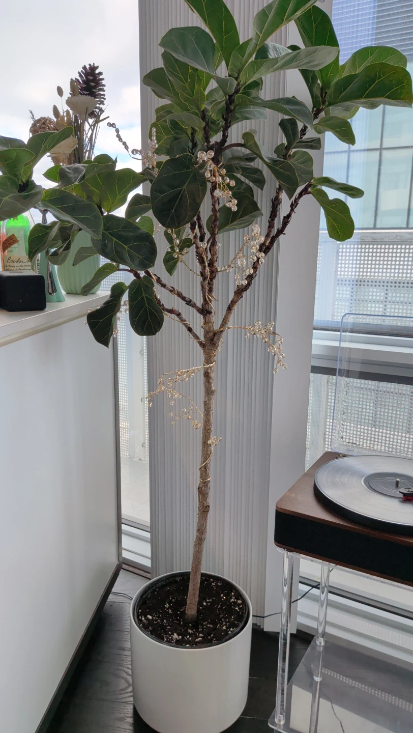 A healthy Fiddle Leaf Fig tree potted in a stylish white container. It's adorned with delicate string lights, adding a warm ambiance. This plant would be great for brightening up a living room or office space!