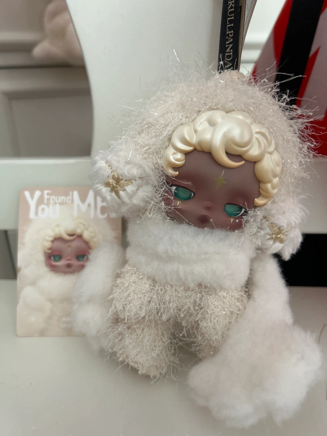 This is a SKULLPANDA "Found You" plush doll. It's a soft, fluffy toy with intricate details. This collectible piece is perfect for display or play!