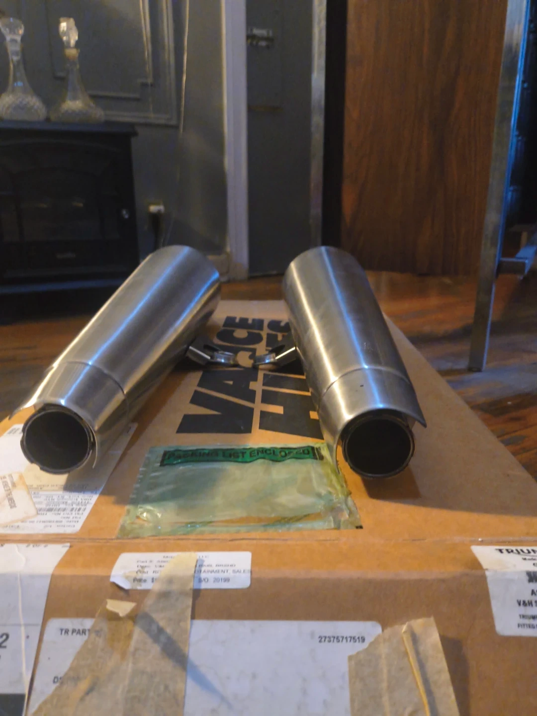 Set of Vance & Hines mufflers for a motorcycle. Stainless steel construction. Includes mounting hardware and is in original packaging. Designed for Triumph motorcycles.