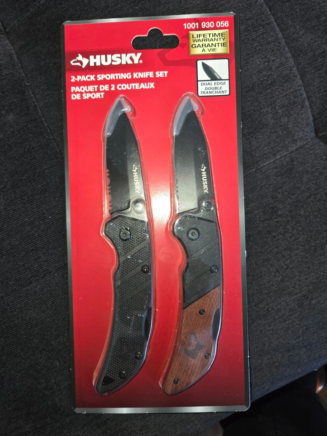 This set includes two sporting knives. One knife features a nylon handle and the other has a wood handle. Both knives have stainless steel blades and a folding lock-back design with a pocket clip. They're great for various tasks!