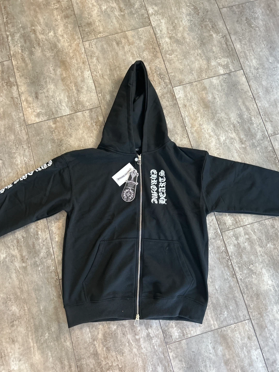 This is a black Chrome Hearts zip-up hoodie. It features graphic text on the chest and sleeves. The hoodie is made of a soft material for comfort. It's a great piece for any fashion enthusiast!