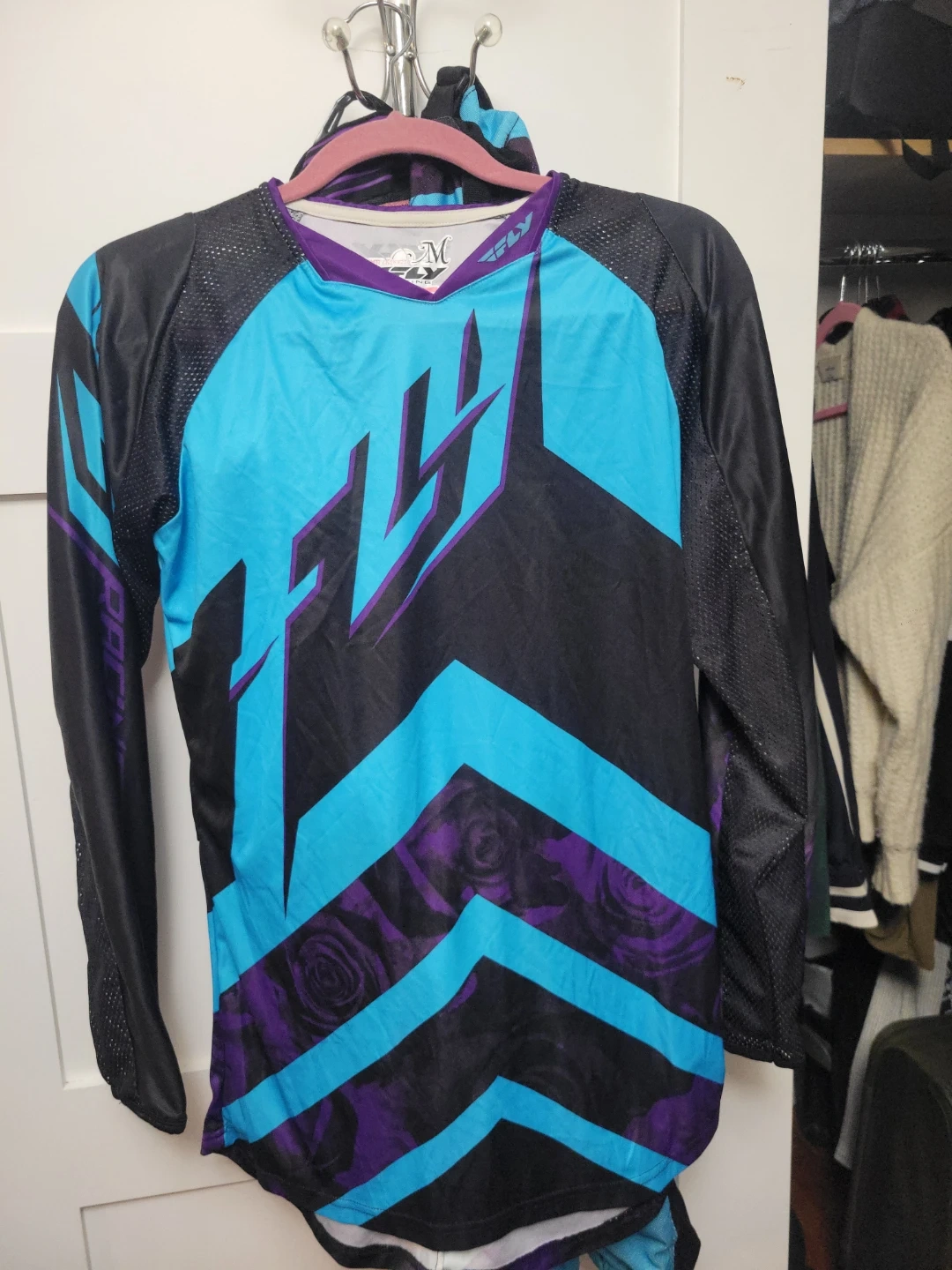 This is a FLY Racing motocross set. It features a vibrant purple, black, and blue design with rose patterns on the lower front and back. The jersey is made of breathable mesh material with long sleeves. Really comfy! Jersey size Medium pants 9/10 fits more like a 6/8